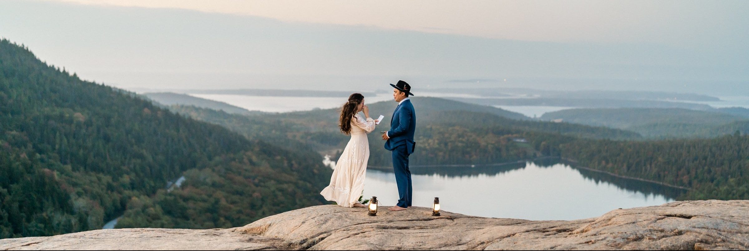 “Acadia does not require a permit for elopements for up to 10 people (this one had 3). This includes everyone involved (including the couple, guests, officiant, photography, etc.). Above 10 people requires a permit and there are limits on the number of people for certain locations. If a permit is needed, the paperwork can be found here and is $75. At this time, there is no additional permit needed for photography. For LNT we stayed on the marked trails and only explored on rugged/sturdy terrain (like gravel paths and granite rock at the top)! Me made sure not to trample vegetation, and carried out what we carried in.” [Jenna, the photographer]