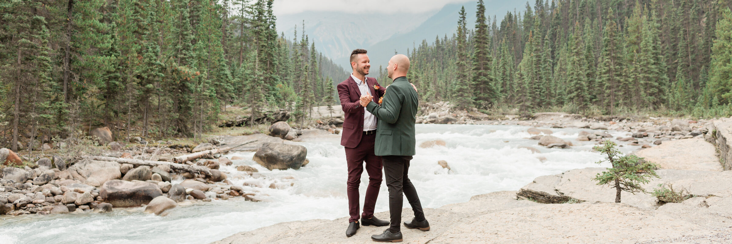 “Jamie and Brandon’s love story unfolds at Mistaya Canyon in Banff National Park. Against the backdrop of turquoise waters and the towering canyon, Jamie and Brandon exchanged vows, surrounded by the vast canyon. Although it was a rainy day, the sun came out for them while they exchanged their vows and rings. They celebrated with a vegan pop tart picnic among the larch trees as they enjoyed the sound of the rushing canyon waters.