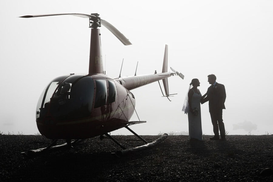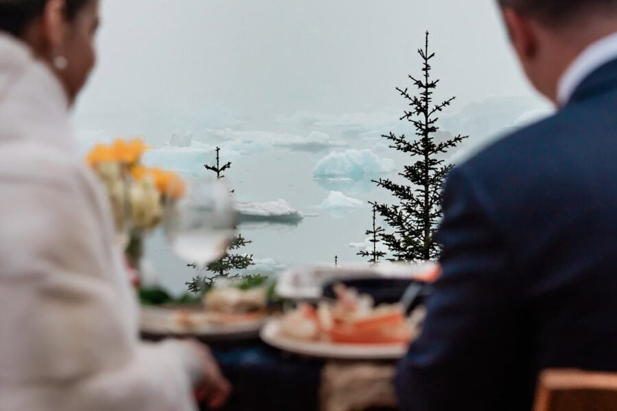 From there, your heli carries you deeper into the wild, where a hidden glamping camp rests on the edge of an iceberg-studded lagoon. For the next 24 hours, this is your home. As you wave goodbye to your heli, your expert backcountry guide (aka “mountain butler”) welcomes you and helps you settle into your private luxury glamping yurt with real bedding, luxe linens, twinkly lights, and cozy blankets. Indulge in a plated dinner of local delicacies (think Alaskan crab legs, or smoked ribs) and a “just-us-sized” wedding cake, all carried in by heli, and, served beautifully at your sweetheart table. With real china, silverware, and candles to set the scene, you ease into the meal, toast with bubbly, and watch icebergs glow in the midnight sun hovering on the horizon.