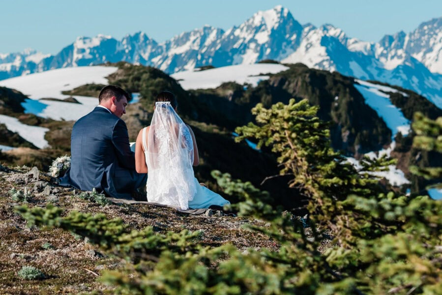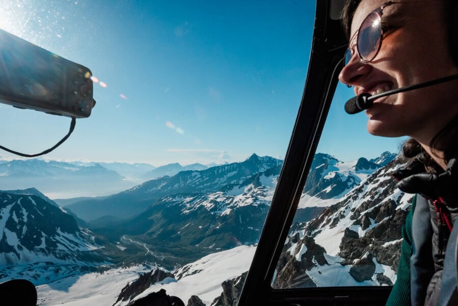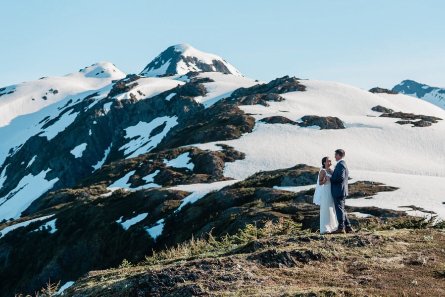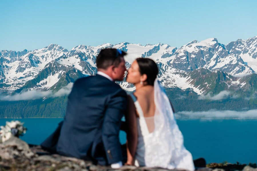 Your story begins in Seward, where you’ll board a private helicopter for a flightseeing journey into the wild. Resurrection Bay, glaciers, ridges, and untouched backcountry stretch out beneath you before your pilot sets down on an alpine ridge. With two full hours on the ground, you’ll have space for vows, portraits, and a styled picnic in a place so remote that a heli is the only way to reach it.