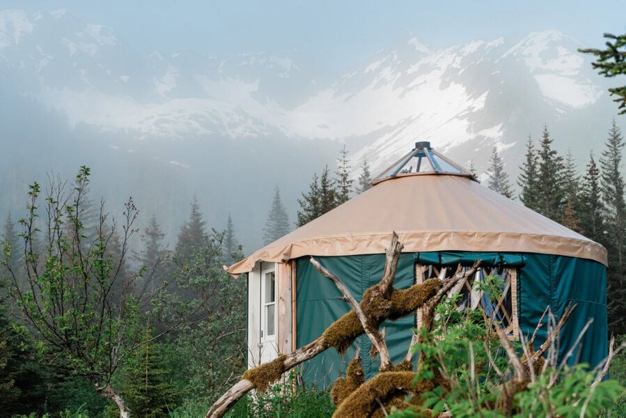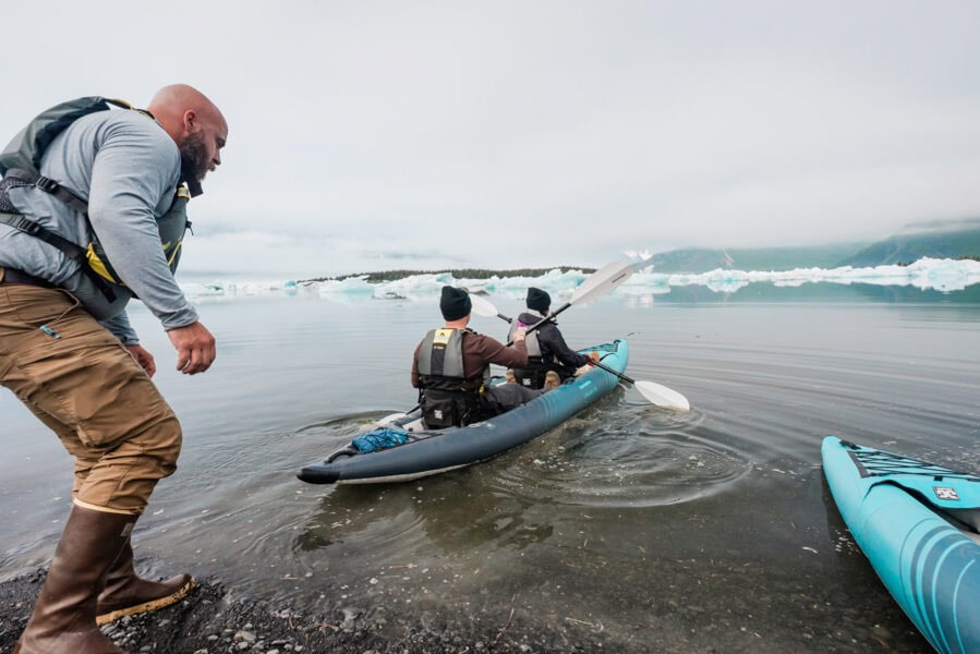 Day Two begins slowly with breakfast delivered to your yurt by your mountain butler. A day of relaxation and celebration, with nothing to do except marvel in this place, together. Enjoy a leisurely, fully-guided once-in-a-lifetime kayak excursion among icebergs, pausing for a shoreline picnic. And, if you’re feeling daring once you return to camp? Taking a cold plunge with icebergs in glacier-fed waters is highly recommended before your private helicopter arrives to fly you back to Seward.