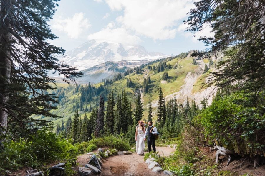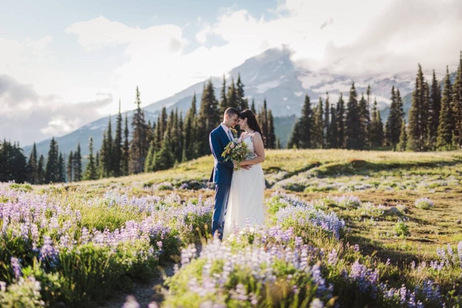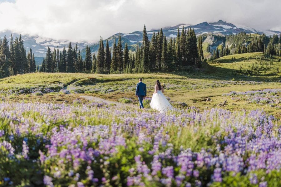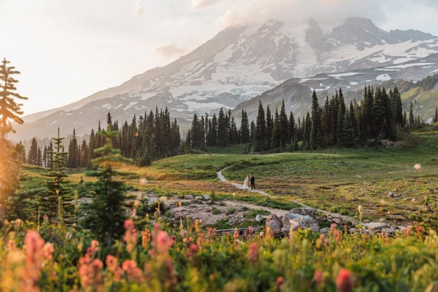 The Alpenglow Adventure is more than an elopement. It is a rare chance to walk beside a glacial river, to stand in a wildflower meadow with Rainier towering above, and to watch the sky transform as evening settles. Your story is told in photographs that freeze the beauty of each moment and in a cinematic film that brings them back to life, filled with your voices, your laughter, and your movement against the mountain’s grandeur. Intimate, cinematic, and unforgettable.