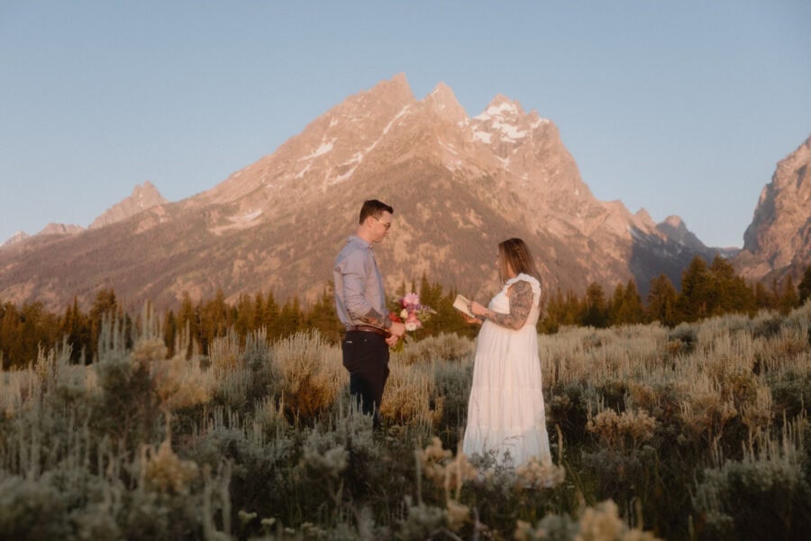 Your day begins before the sun crests the peaks — and we’re right there with you. We’ll meet you at your Jackson Hole Resort accommodations, where I’ll help you into your dress and gather your details with care. Meanwhile, my husband and your officiant will accompany your partner to the first look location, making sure everything is perfectly set. It’s a seamless, full-service experience — from the very first moment.