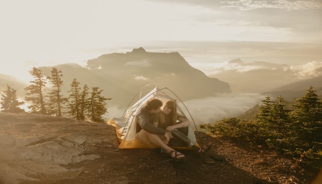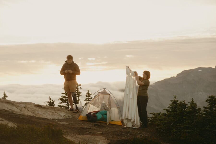 Your wedding adventure begins right at the trailhead, with backpacks loaded, hiking boots laced, and your wedding outfits carefully tucked away for later. There’s an excitement in the air as we take the first steps onto the trail, leaving behind the noise of everyday life and heading straight into the stillness of the wilderness. The path winds through alpine meadows and towering evergreens, and with every mile the mountains seem to rise higher around us. Before long, we’ll find the perfect campsite—a little slice of backcountry heaven to call home for the night.