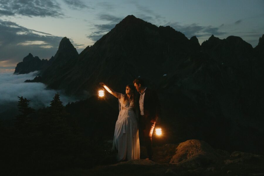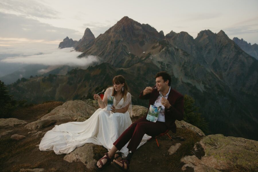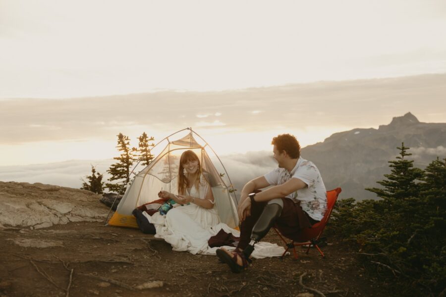 After we pitch the tents and maybe enjoy a relaxed lunch together, it’s time for the day to shift into something even more magical. You’ll slip into your wedding attire, transform the campsite into a place of celebration, and share your first look surrounded by the raw beauty of the backcountry. The quiet of the wilderness makes this moment feel incredibly private, like the entire mountain range paused just for the two of you.