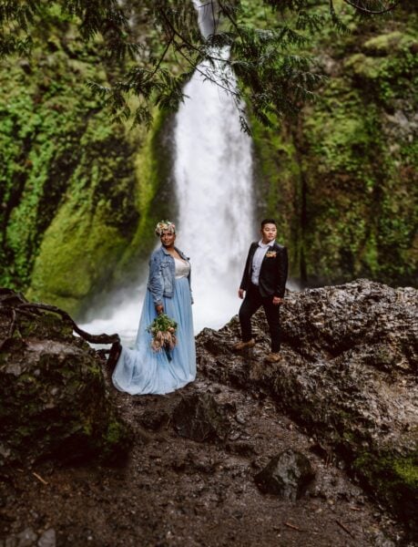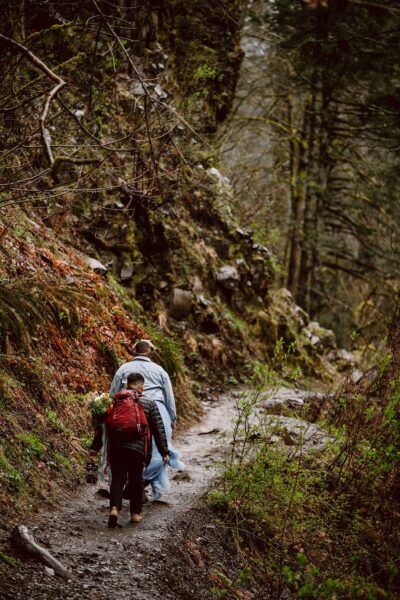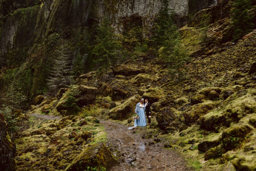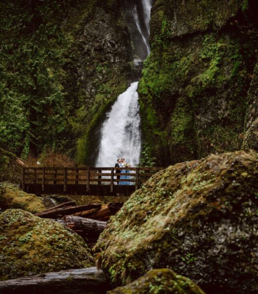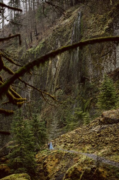 Once you’re ready to go, we’ll take a short drive to a nearby trail. This ~2 mile, easy to moderate hike will lead you through lush forest, past a smaller waterfall, through a moss covered canyon, and finally ending at a roaring, grand waterfall surrounded by basalt columns. It’s here that you’ll find a quiet nook to exchange your vows with one another, taking in the sound of the water, the cool mist from the falls, the vibrant mossy rocks, and the words of your life partner.