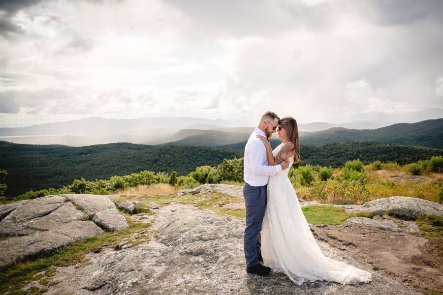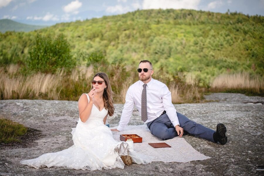 After we’ve had our fun splashing around, we’ll make our way out to Eaton for a short hike at one of my favorite New Hampshire peaks. Once we’re at the summit, we’ll be met with truly stunning views of the White Mountains and the western peaks of Maine. We’ll explore the scrub bushes on this rolling summit and picnic atop the granite slabs. Then, as the sun begins to set, you’ll exchange your vows amidst the golden glow of the sun setting behind White Mountain National Forest