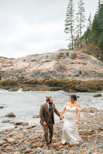 Returning to Ocean Path, we’ll continue finding the coolest cliffs and hidden coves without the chaos of crowds. The entire time, you’ll be more focused on “holy crap, this view!” versus “uh, what do I do with my hands?” By mid morning, we’ll have reached Sand Beach, Acadia’s stretch of soft shoreline framed by granite cliffs. Kick off your shoes, play in the surf, and let yourselves sink into those carefree, just-married vibes. These are the in-between moments that often end up being favorites: the laughter, the splashing, the sand between your toes.
