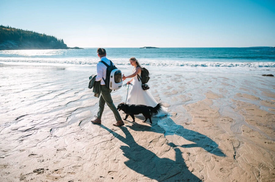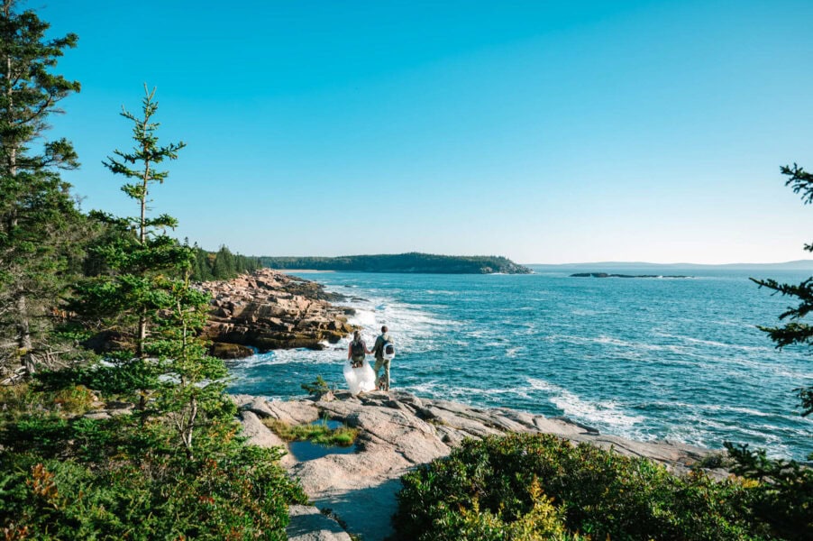 Returning to Ocean Path, we’ll continue finding the most incredible cliffs and hidden coves without the chaos of crowds. The entire time, you’ll be more focused on “holy crap, this view!” versus “uh, what do I do with my hands?” By mid-morning, we’ll have reached Sand Beach, Acadia’s stretch of soft shoreline framed by granite cliffs. Kick off your shoes, play in the surf, and let yourselves sink into those carefree, just-married vibes. These are the in-between moments that often end up being favorites: the laughter, the splashing, the sand between your toes.