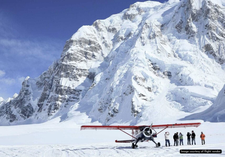 At the airstrip, your private ski plane awaits. After a safety briefing, you lift into the Alaska Range — a flightseeing experience that is breathtaking in its own right, not just transport. You’ll soar past jagged ridges, sprawling glaciers, and the towering mass of Denali itself before touching down on a glacier snowfield. The 1.5-hour charter includes about 45 minutes on the ground — a rare chance to exchange vows on a glacier in Denali via private flight, explore together, and capture portraits while feeling impossibly small in the vast mountain landscape.