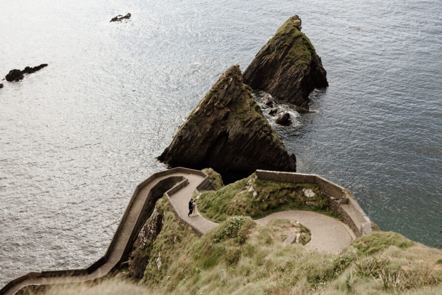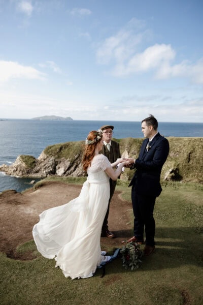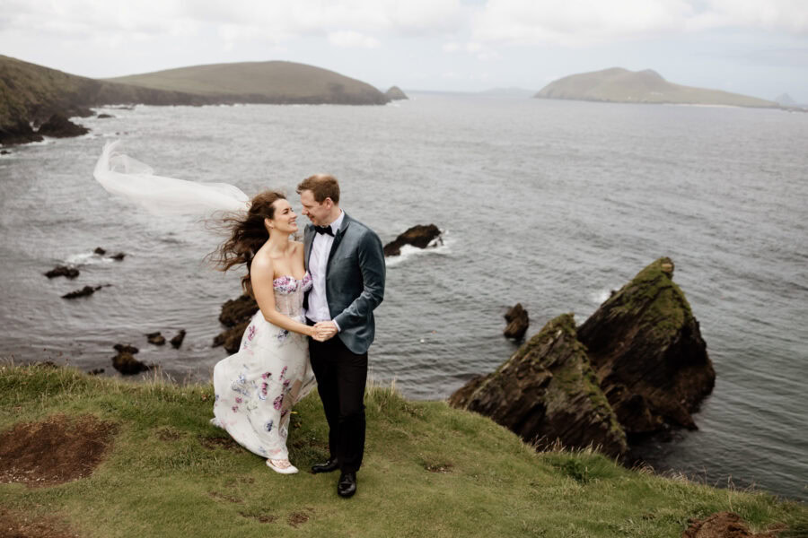 Your day begins with relaxed morning preparations — hair, makeup, and a quiet sense of excitement — at your hotel or Airbnb in Dingle town. From there, we’ll journey west along the legendary Slea Head Drive, a route bursting with ocean views and rich Irish heritage. You’ll exchange your vows overlooking the Atlantic at one of Dingle’s most iconic cliffside locations, surrounded by wild sea air and sweeping views of the Blasket Islands — a ceremony spot that feels private, breathtaking, and undeniably Irish.