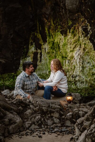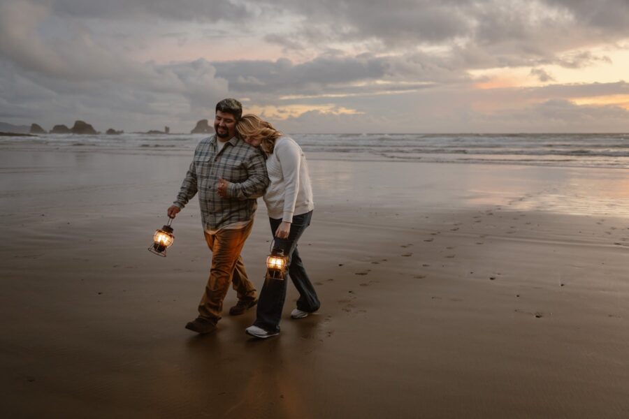 After your private vows, you’ll head to one more location in nearby Ecola State Park to watch the sunset together. You’ll leisurely wander this second beach, watching waves crash against sea stacks and cozying up together with lanterns as the sun goes beyond the horizon.