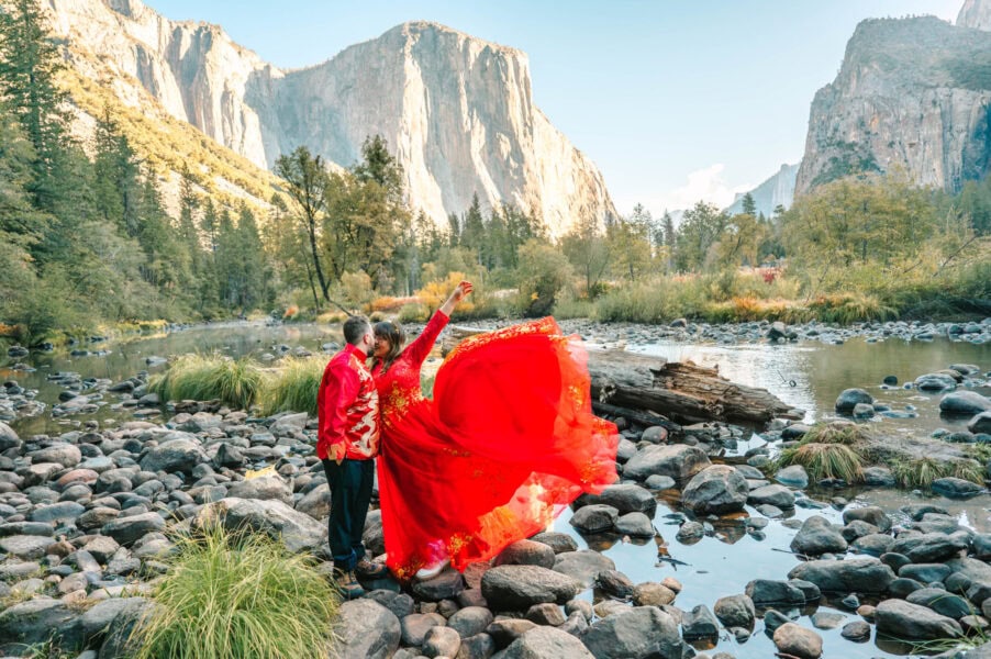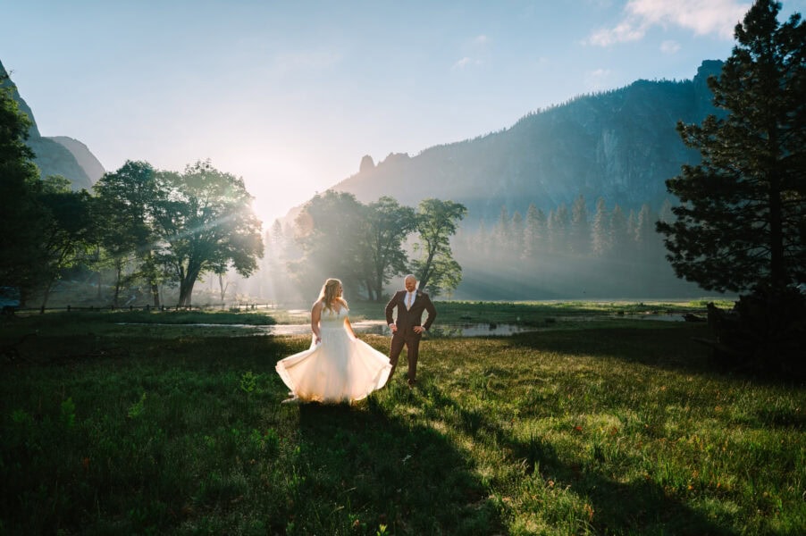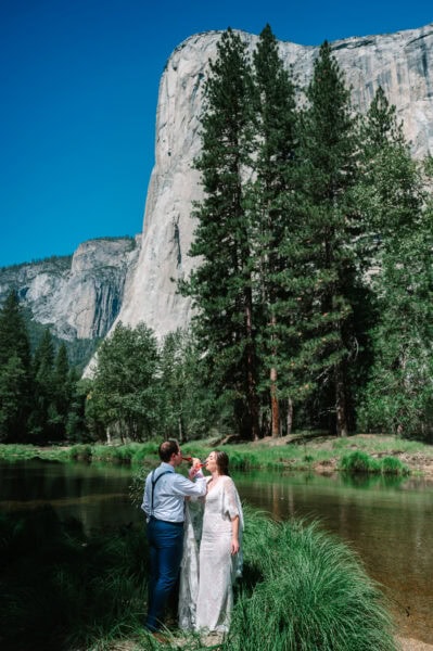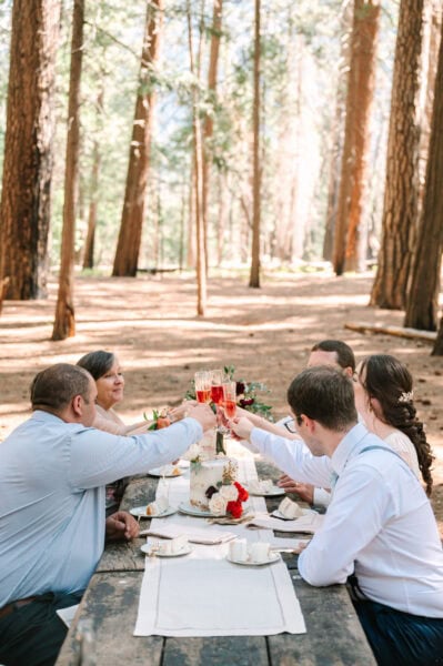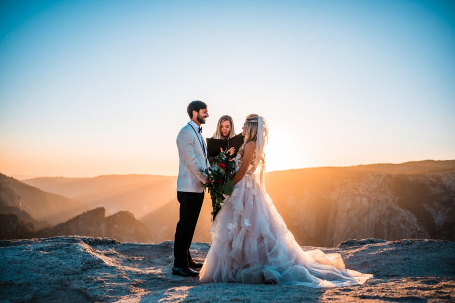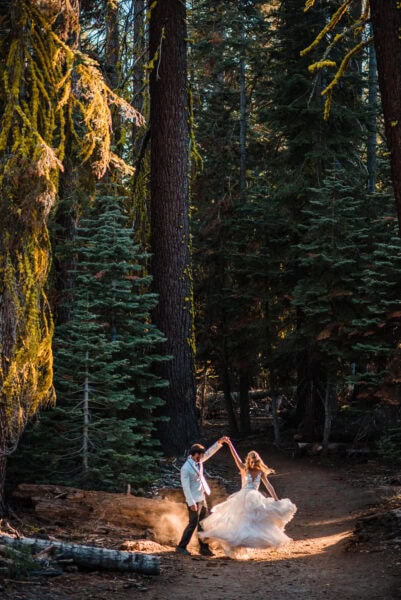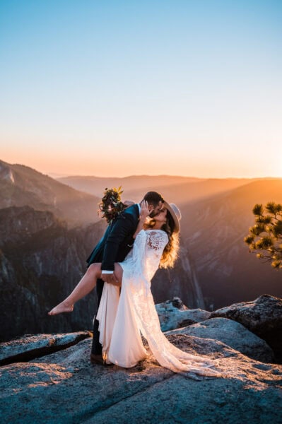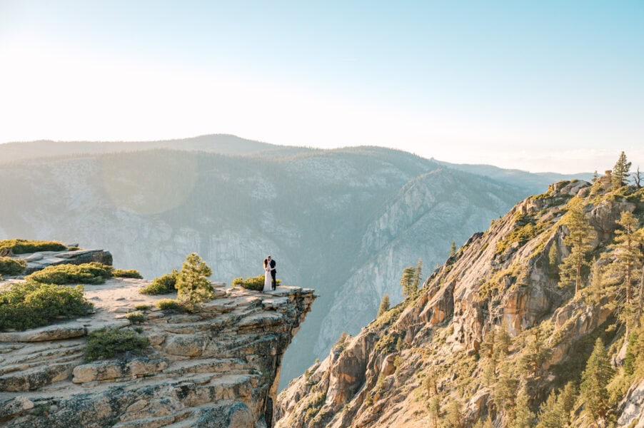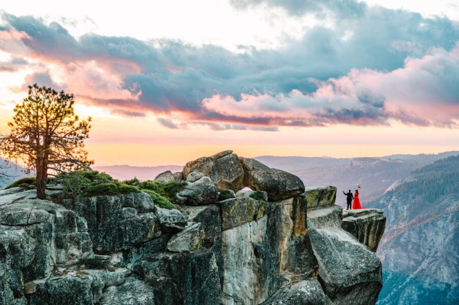 In the middle of the day, you’ll take a break—time to rest, explore a bit on your own, or simply enjoy being in Yosemite without a schedule. Then, as evening approaches, we’ll meet back up for the grand finale—a sunset hike to Taft Point. The trail winds through the forest before opening to sweeping cliffs high above Yosemite Valley. As the sky shifts into soft oranges, pinks, and purples, you’ll share champagne and portraits on the edge of the world. By the time the sun disappears behind the Sierra Nevada, you’ll have spent the day seeing Yosemite from every angle—sunrise to sunset, valley floor to cliffside—woven together into one unforgettable elopement story.