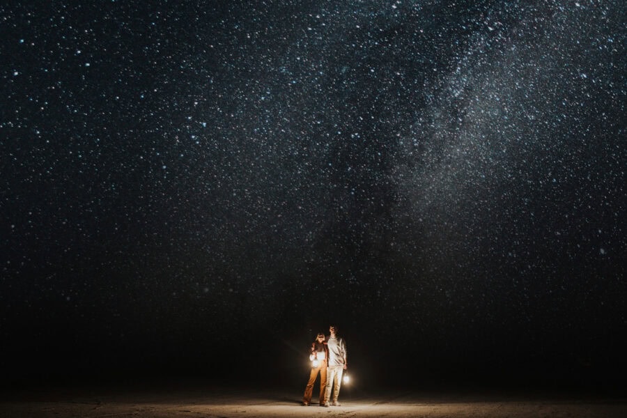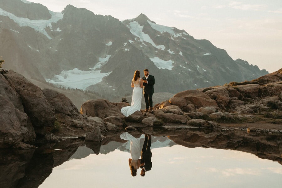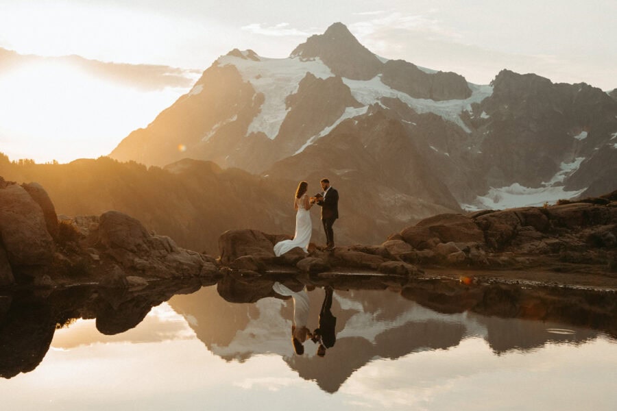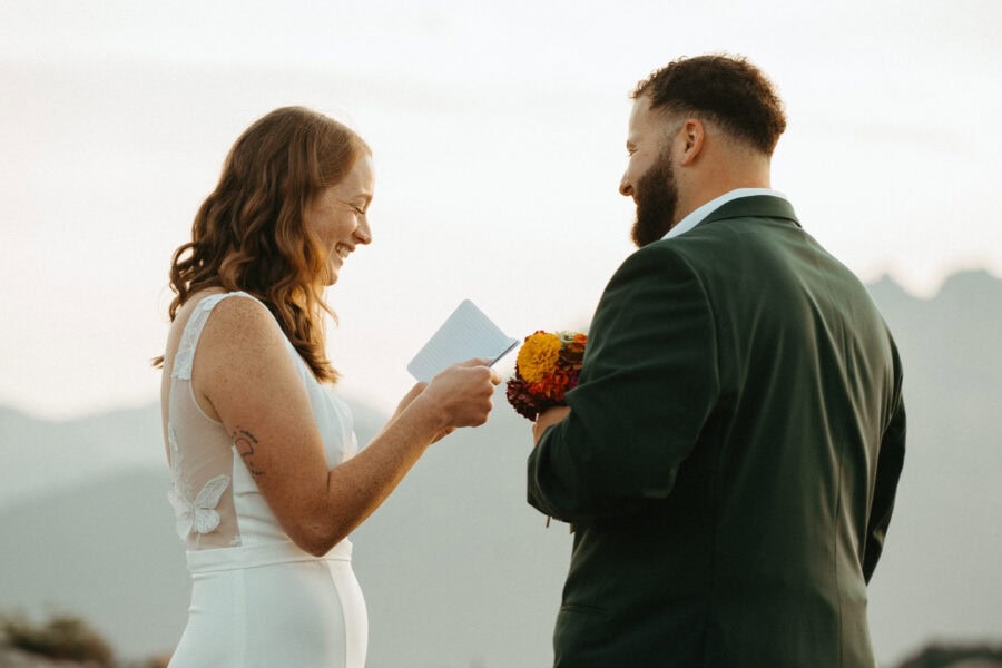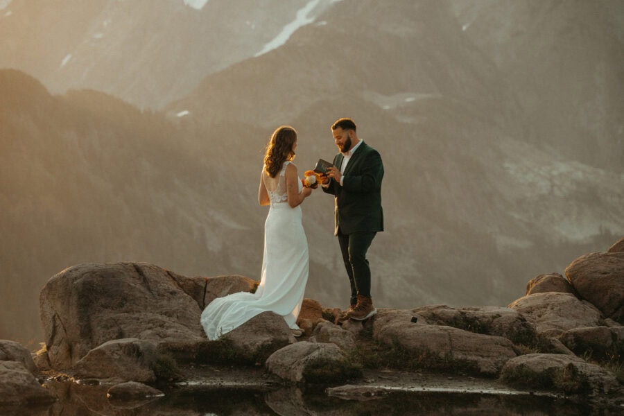 As the sky starts to shift, we’ll move into position for sunrise. The light comes in gradually here, first as a glow on the horizon, then slowly working its way across the peaks. You’ll share your vows as the sun comes up behind the mountains and begins to hit the surrounding peaks. The ceremony timing is planned around first light so the moment feels natural and grounded rather than rushed or staged.
