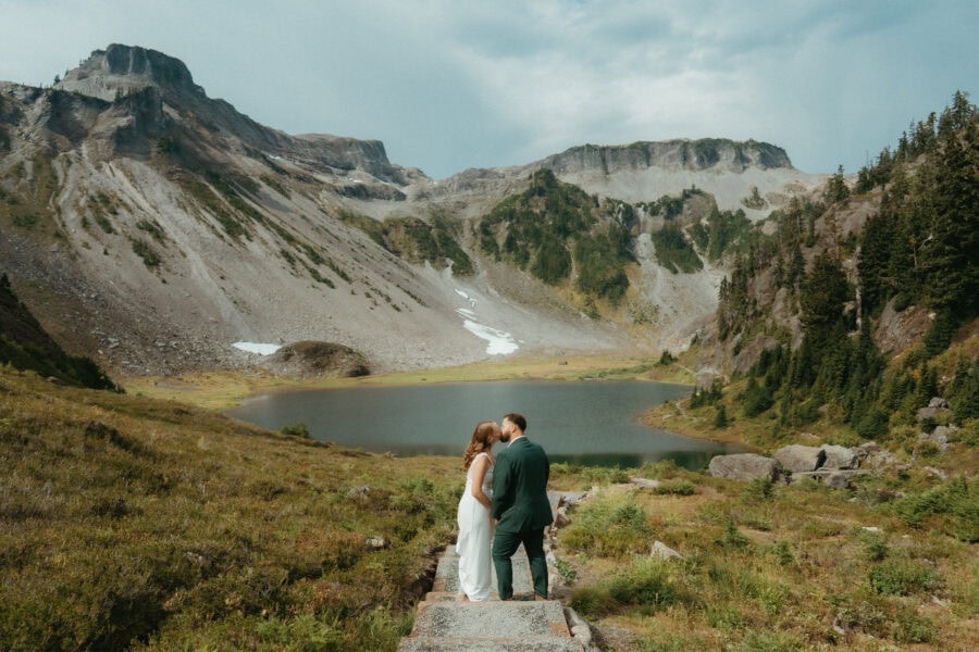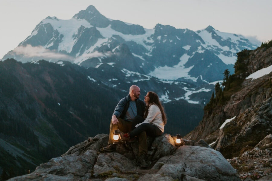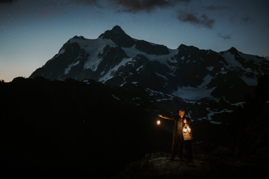 Your Washington mountain elopement will begin during blue hour, when the world is quiet and the sky is at its deepest shade of night. We’ll arrive at Artist Point while the stars are still overhead, taking time to slow down, settle in, and create space for the experience to unfold. Under dark alpine skies, we’ll capture astrophotography that feels calm and expansive: you are wrapped in layers, close together, with the mountains reduced to soft silhouettes beneath the stars.