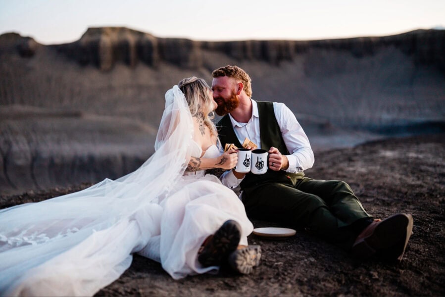 As the sun sets below the horizon and the landscape glows in the final light of the day, you can celebrate in whatever way feels most authentic to you. Perhaps a first dance with not another soul around, maybe a picnic with charcuterie and champagne, or it might be that you’d simply like to tuck into pizza and beers.
