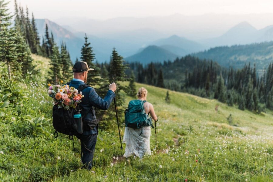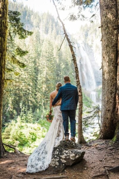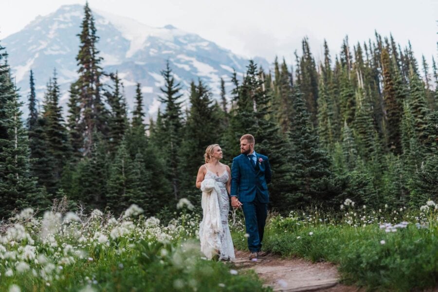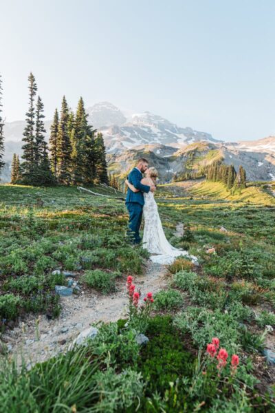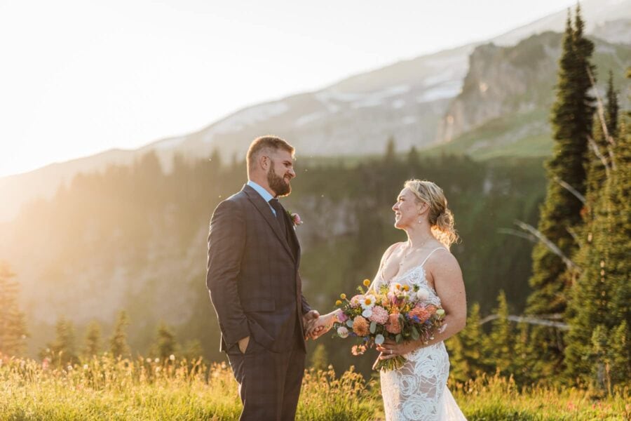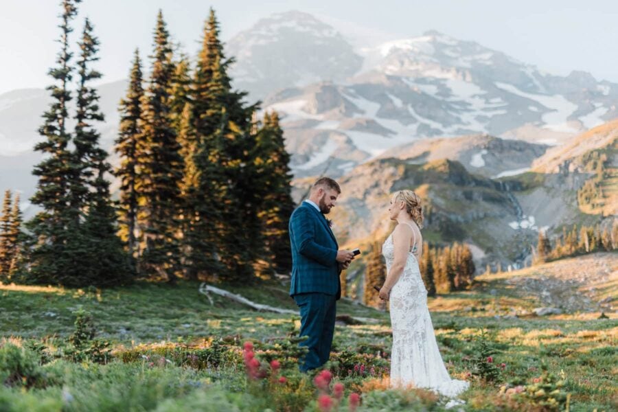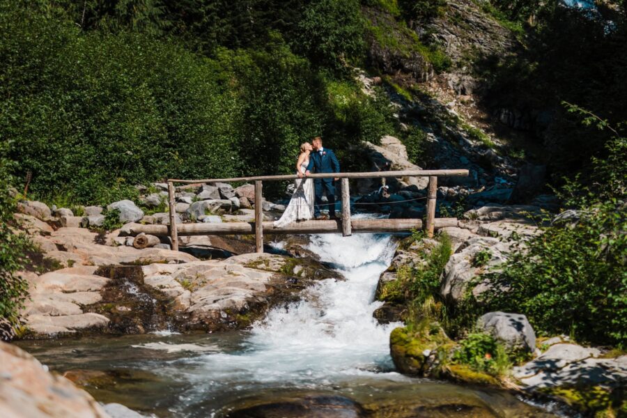 As the day unfolds, we continue deeper into the alpine until Rainier rises impossibly close, her glaciers gleaming in the late light. This is where you’ll exchange vows, not at a crowded overlook but in a tucked-away meadow with wildflowers at your feet and the mountain standing right before you, closer and grander than you ever imagined. It’s private, emotional, and entirely your own.