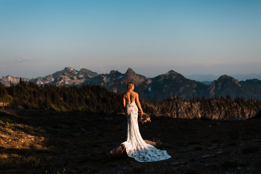 After your vows, celebration unfolds with intention: champagne popped against a backdrop of glaciers, a quiet picnic on alpine grass, or your first dance as the sky glows pink and gold. As twilight deepens, portraits unfold in the soft alpenglow, your connection glowing against the silhouette of Rainier and the shimmer of the first stars above.