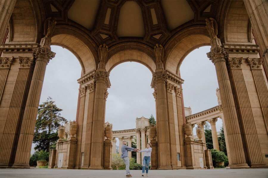 San Francisco is a city where architecture and coastline meet, and this elopement lets you soak in both sides of its beauty. Golden Gate Promises begins with your ceremony beneath the iconic rotunda of the Palace of Fine Arts, where soaring columns and timeless arches create a cinematic backdrop for your vows. With soft light filtering through the dome, it feels both intimate and grand, a perfect place to anchor your day.
