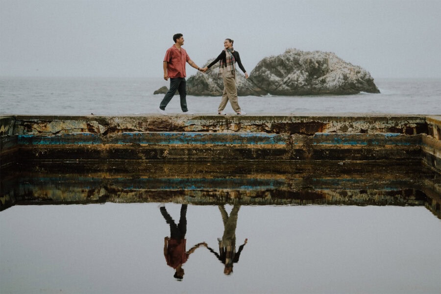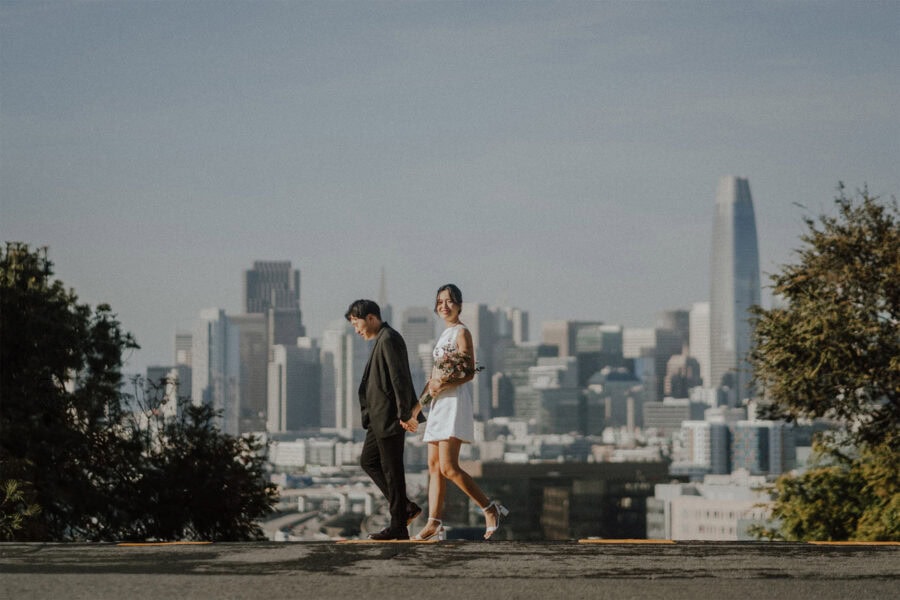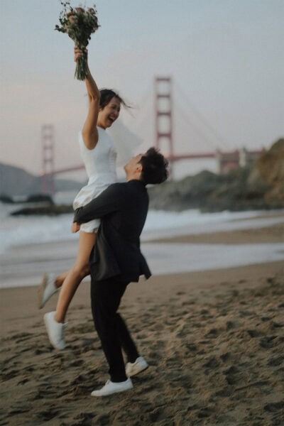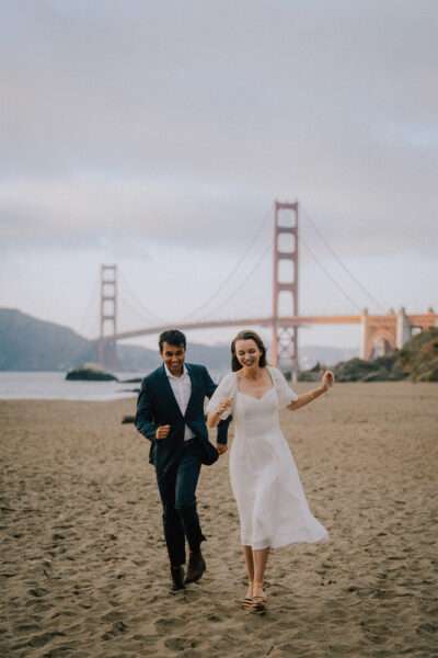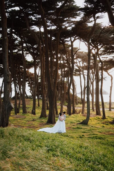 We’ll finish the day at Lands End, where wind-sculpted cypress trees stand tall against the sea. Here, as the sun drifts toward the horizon, we’ll capture golden-hour portraits that feel both iconic and deeply personal. Barefoot on the sand (yes, the beach is right there) or swept up in the ocean breeze on the cliffs, this closing chapter is the perfect coastal exhale to your San Francisco elopement story.