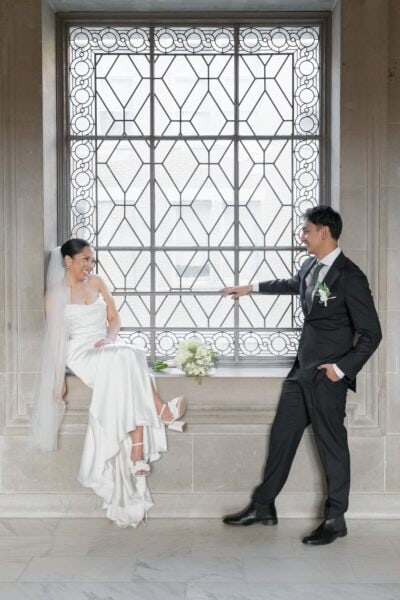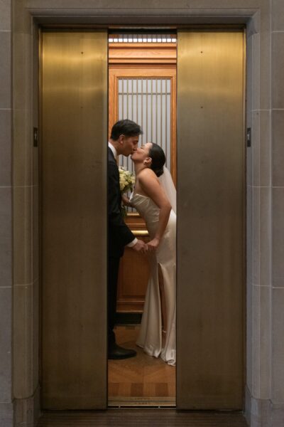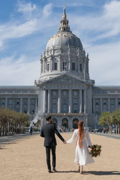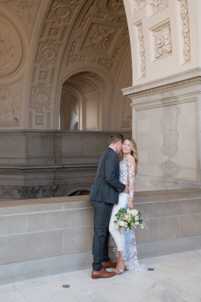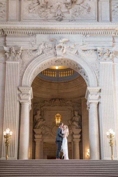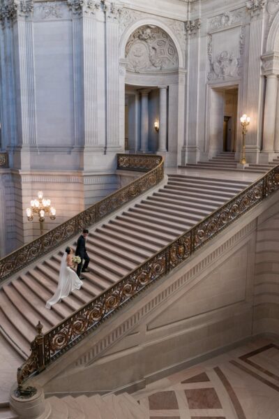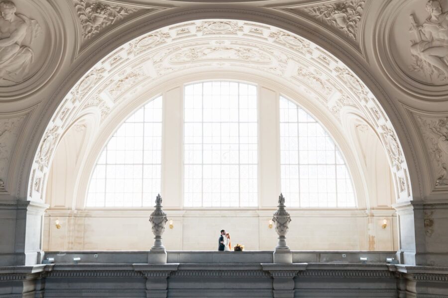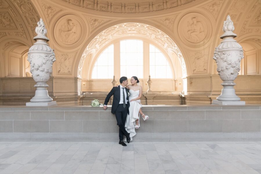 As sunlight streams through the towering windows of San Francisco City Hall, you’ll stand hand in hand on the grand staircase, surrounded by golden light and timeless architecture as you say ‘I do.’