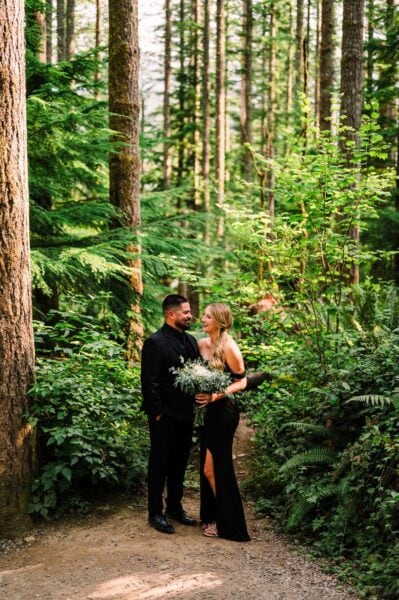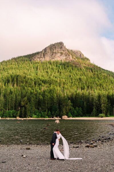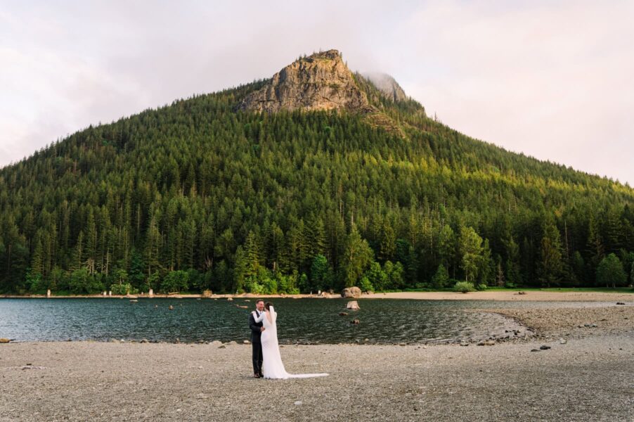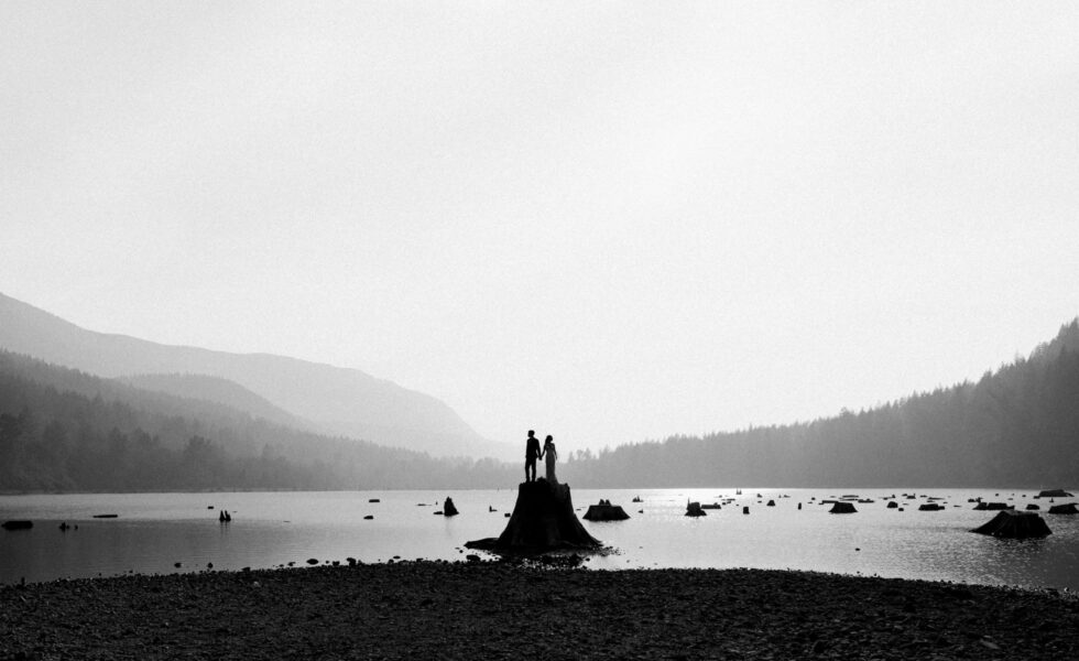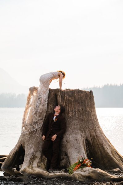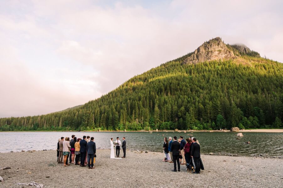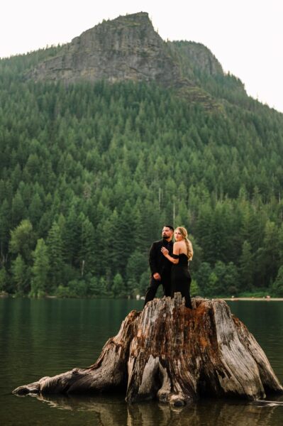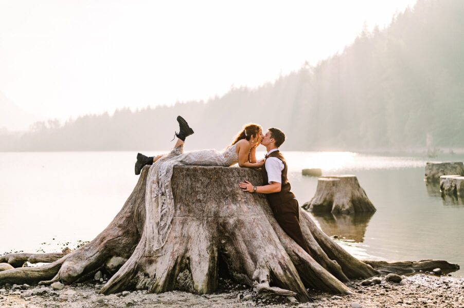 Looking for something short and sweet where you can include your favorite people? This is for you! We’ll head to an easy-access lake just about an hour outside of Seattle to enjoy gorgeous views just steps away from your car. When you and your love arrive (either in separate cars, with one of you in the backseat, or with your wedding attire in garment bags ready to be changed into), we’ll do a first look in the forest before joining your loved ones on the lake shore for your ceremony. After your vows to one another, we’ll take formal group portraits with your guests before heading off to enjoy some solo couples portraits with the lake’s iconic tree stumps in the background!