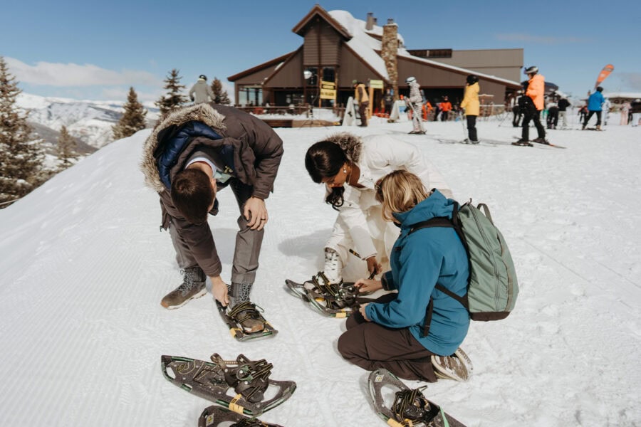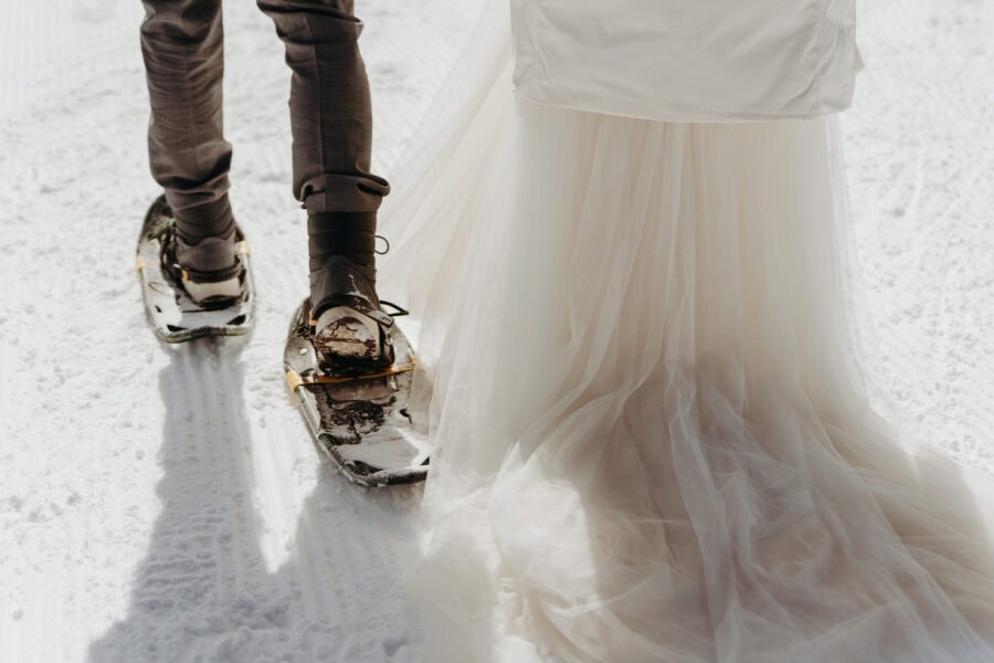 Once ready, you travel to the ceremony location and begin a short snowshoe walk through the forest. The trail is packed with fresh snow, and the walk is steady and calm as you move side by side toward a small clearing. The ceremony takes place in the morning, surrounded by snow-covered trees. You stand together and share your vows with the forest around you, then spend time nearby for portraits using the open snow, tree lines, and winter light before snowshoeing back.