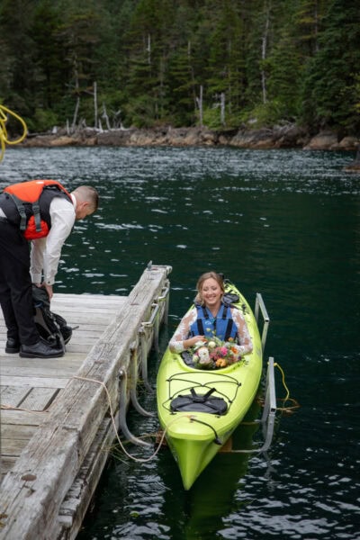 Your days unfold through exploration. You’ll kayak along the shoreline and into quiet coves, pull up where the landscape invites you to linger, and hike through forested trails and coastal terrain. As you move through the island, we’re paying attention to light, privacy, and how each place feels, allowing the setting for your ceremony to take shape naturally through the experience itself.