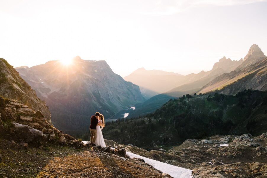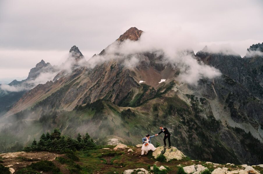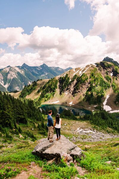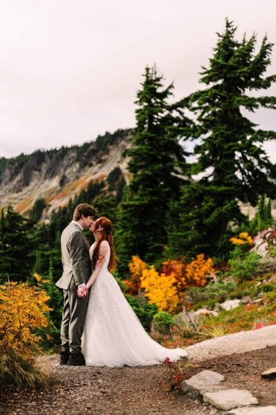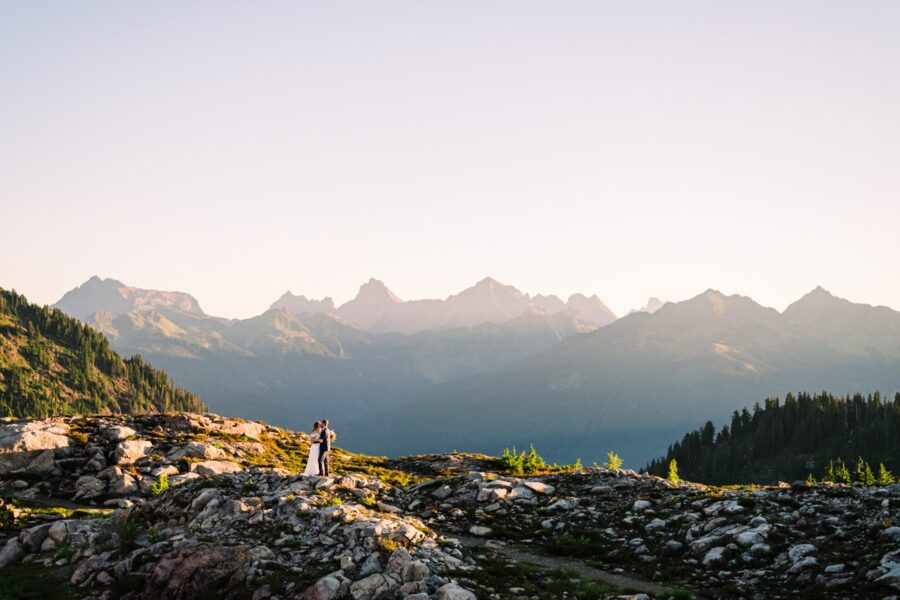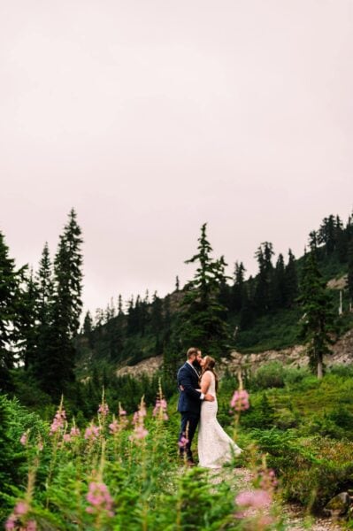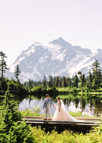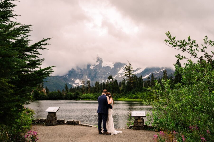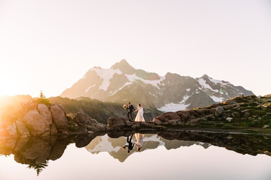 You’ll be waking up before the sun, and it’ll be worth every minute of sleep you don’t get. We’ll meet on the mountaintop of Artist Point to take portraits at my favorite reflection pond, with just you two and the mountains and the golden glow of the sky. From there, we’ll head down into the glacier-carved valley for a private ceremony where you two can exchange your vows with the wildflowers and mountains as witnesses. This spot is private and underrated, and gorgeous in all kinds of weather.