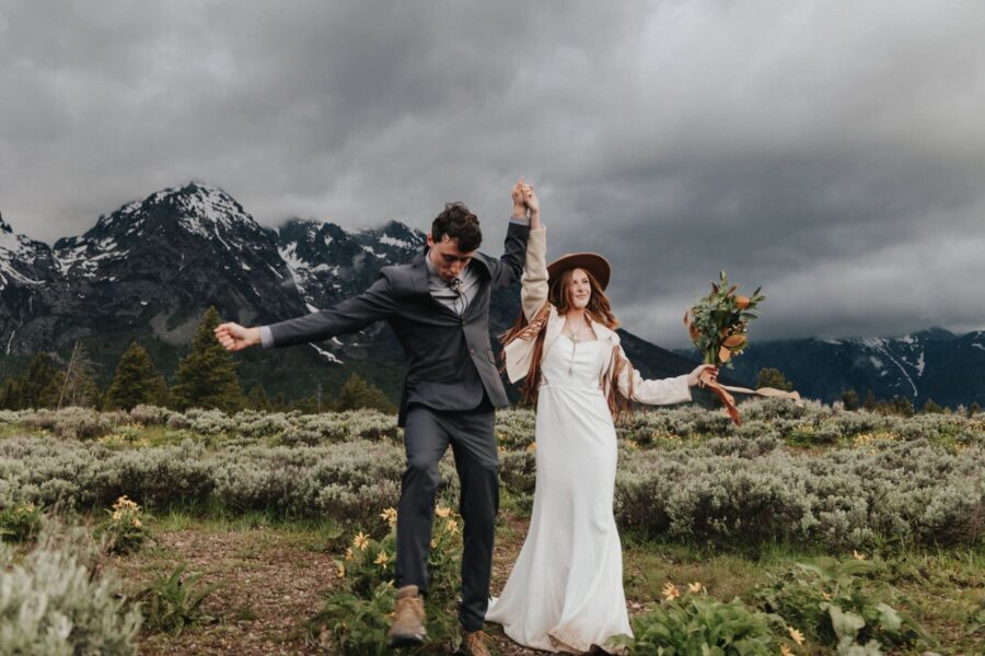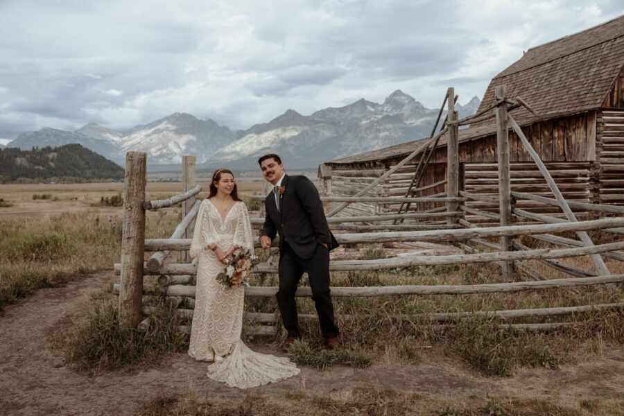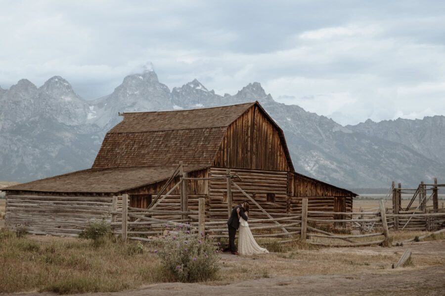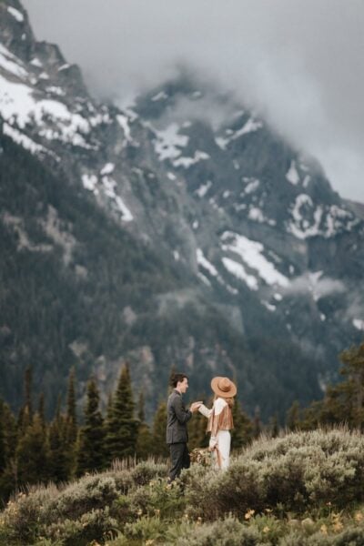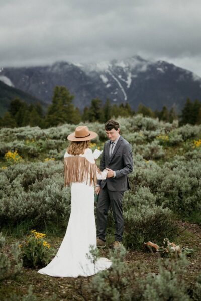 We’ll reunite just as the sky starts to glow. Your first look takes place in a wide open sagebrush field, the Tetons glowing behind you in soft alpenglow. It’s peaceful and cinematic — a private world, just for you two. You’ll exchange private vows in the early light, holding space for each other before the full day unfolds.