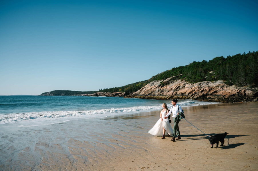 Returning to Ocean Path, we’ll continue finding the most incredible cliffs and hidden coves without the chaos of crowds. The entire time, you’ll be more focused on “holy crap, this view!” versus “uh, what do I do with my hands?” By mid-morning, we’ll have reached Sand Beach, Acadia’s stretch of soft shoreline framed by granite cliffs. Kick off your shoes, play in the surf, and let yourselves sink into those carefree, just-married vibes. These are the in-between moments that often end up being favorites: the laughter, the splashing, the sand between your toes.