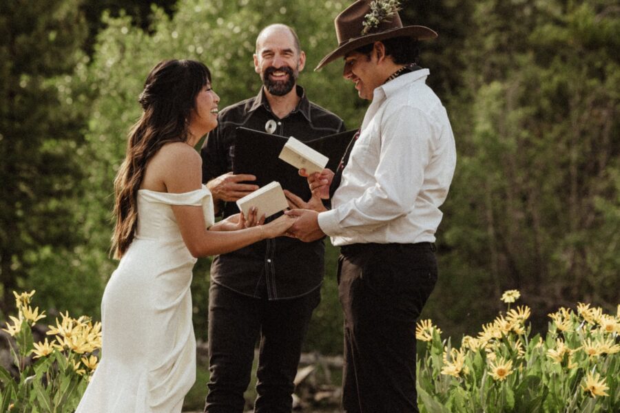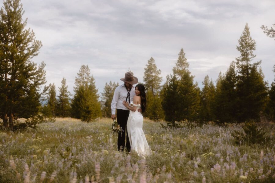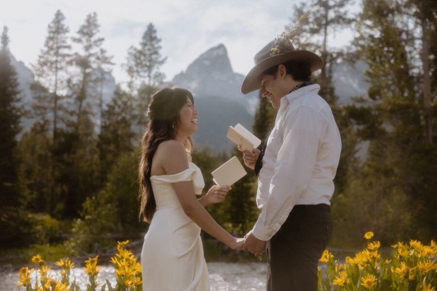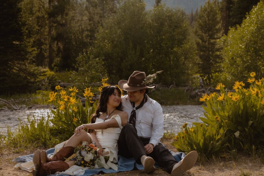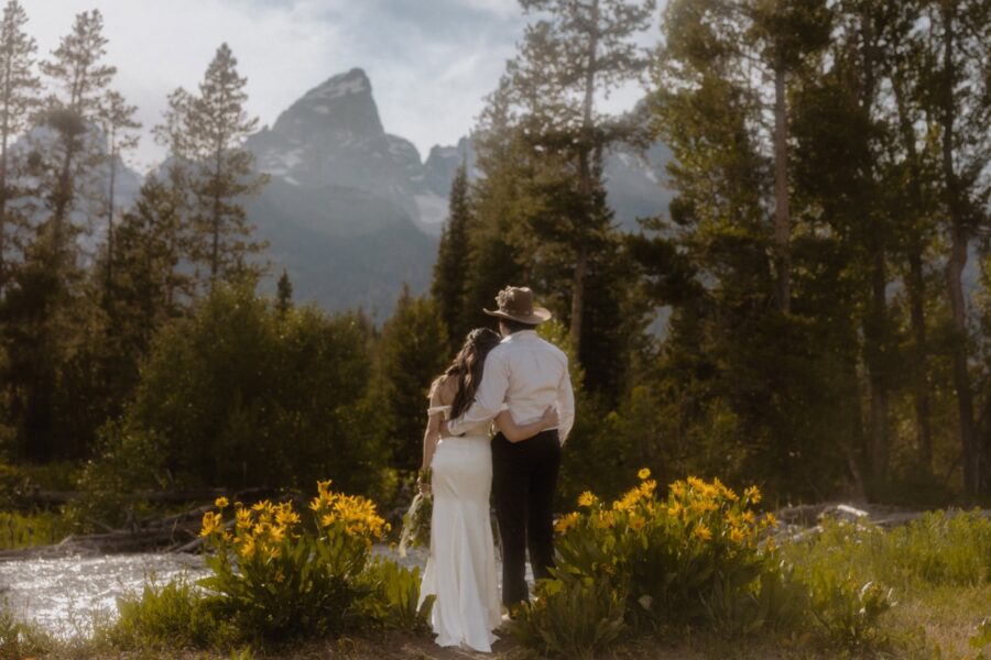Once you’re dressed and glowing, we’ll meet for a private first look and vow exchange tucked into a quiet sagebrush field — just the two of you, with the Tetons rising behind. It’s personal, grounding, and quietly electric. Then we’ll walk together to your ceremony site along the river, where you’ll stand in a field of wildflowers with the mountains mirrored in the water. The Traveling Officiant will guide you through a personalized ceremony — heartfelt, honest, and full of connection.