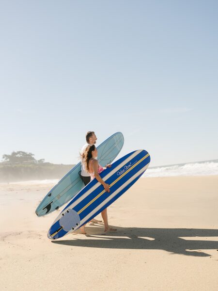 Your day begins before the rest of the coast has even stirred. At sunrise, you’ll slip into the ocean for a private surf session at Big Creek Beach, when the beach is quiet, the air is crisp, and the golden light begins to break through the fog. With waves crashing against the cliffs and the iconic rock formations surrounding you, it’s an exhilarating, playful way to start your wedding day, just the two of you laughing, splashing, and savoring the magic of an empty shoreline.
