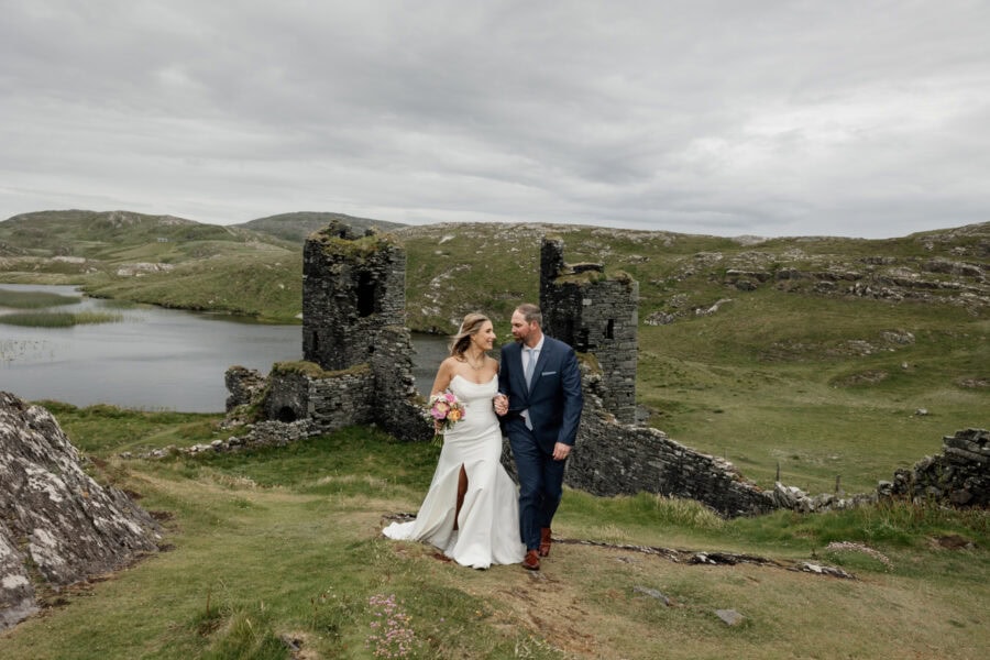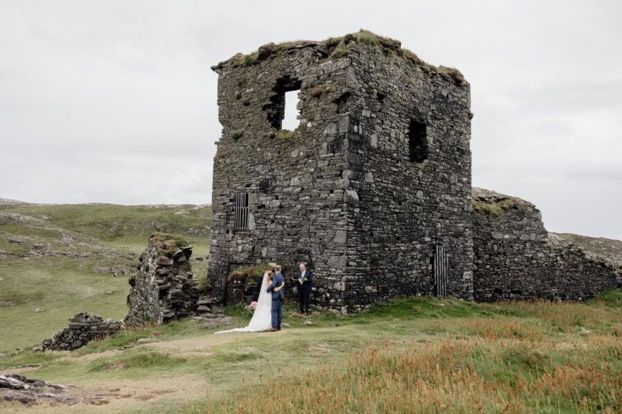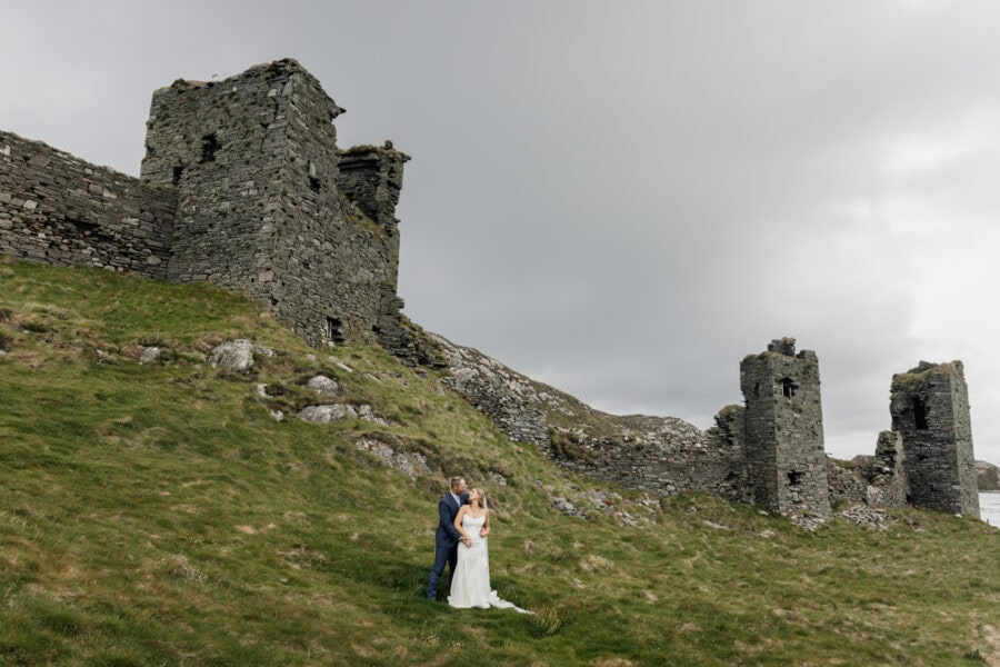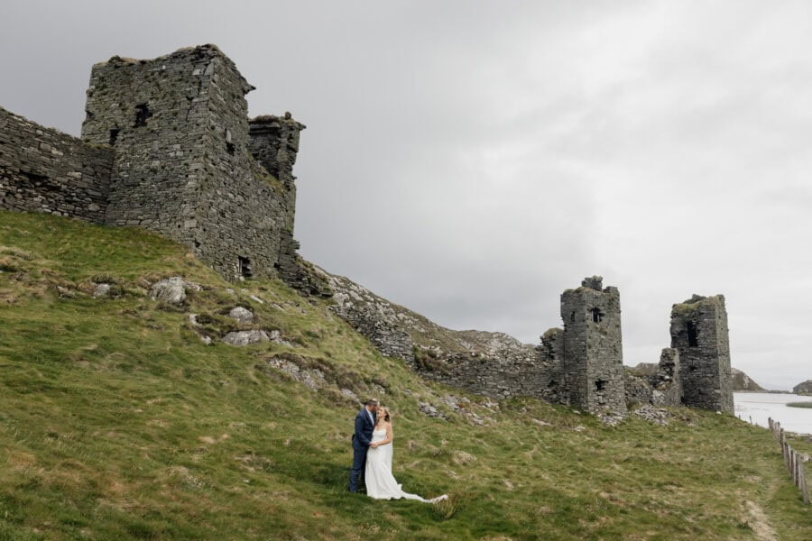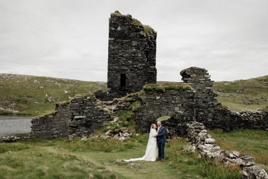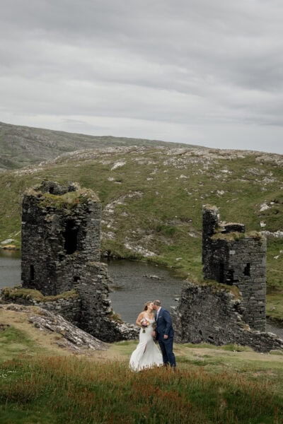 Set on the wild and rugged Mizen Peninsula in West Cork, Three Castle Head is one of Ireland’s most breathtaking and mysterious places to elope. Overlooking the roaring Atlantic and hidden among windswept cliffs, this 15th-century ruin tells tales of love, loss, and legend — it’s said to be haunted by the ghost of Lady Katherine, who wanders the grounds searching for her lost love. The atmosphere is hauntingly romantic, with its ivy-clad towers and crumbling stone walls standing guard over the turquoise lake below.