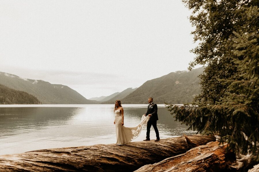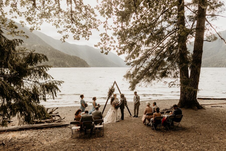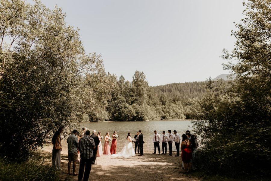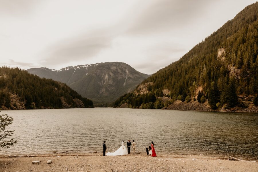 From there, we’ll move right into your ceremony at the water’s edge. With the lake stretching out behind you and forested mountains wrapping around the shoreline, you’ll exchange vows in a setting that feels wild yet peaceful. Your closest friends and family can gather nearby, standing in the grass or along the shore, witnessing your promises surrounded by natural beauty.