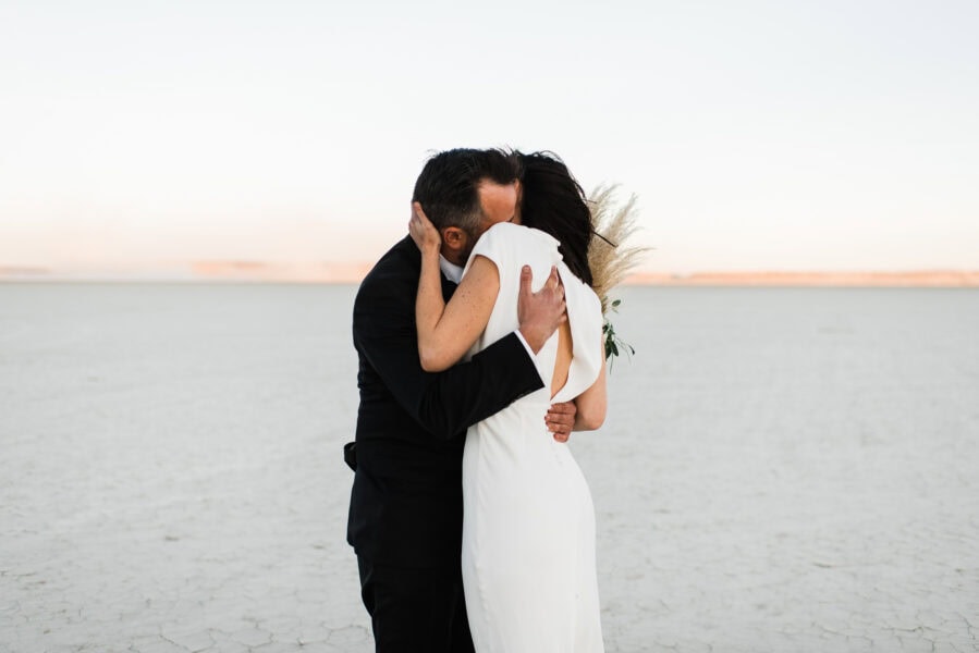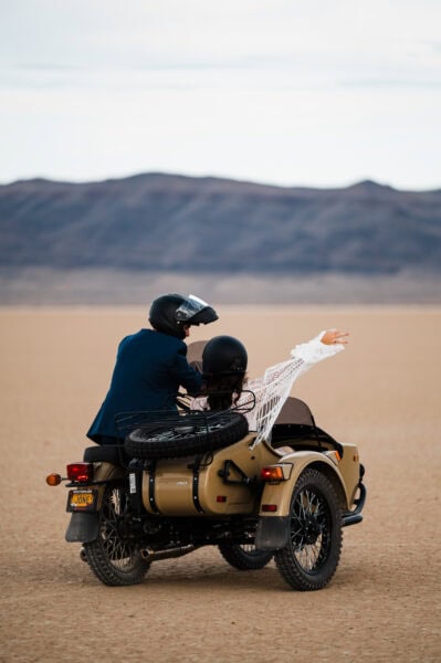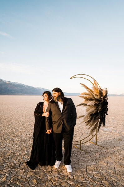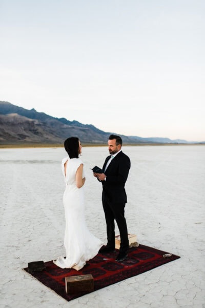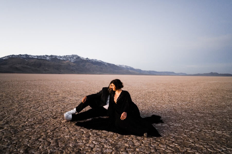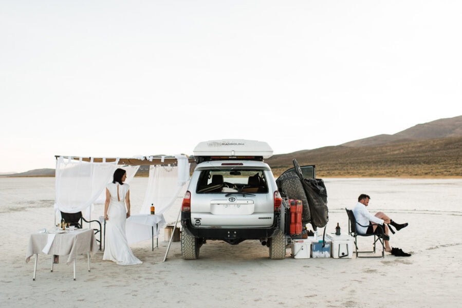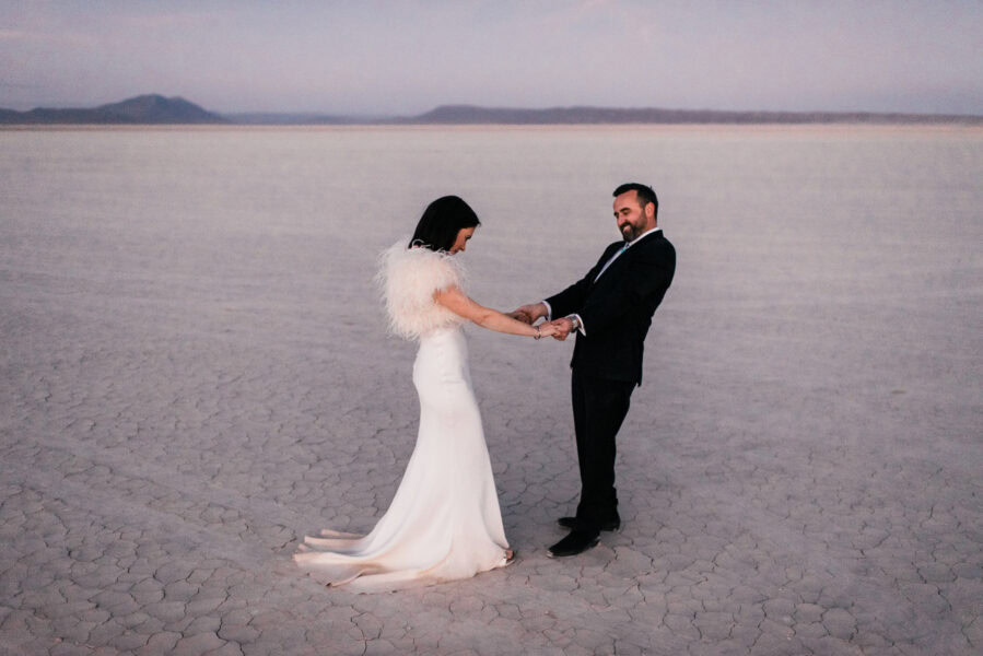 Start your day by getting ready in playa-side lodgings with your elopement specialist HMUA. Spend sunrise watching the sun peek over the saddle across the playa while listening to coyotes howl in the distance, and wild mustang herds whinny. After a quick breakfast, head out with your vehicle onto the playa. Let’s see how far we can drive before we hit the other side! Spend a few minutes selecting your perfect ceremony spot for later. Experience the feel of driving on a surface with no road lines. 25mph feels like 50!