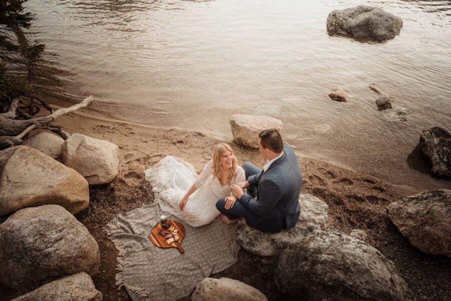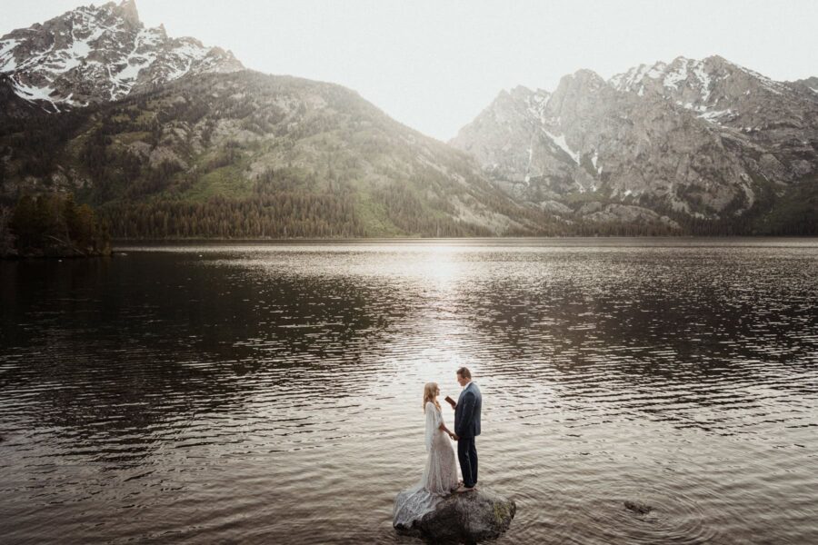 You’ll wake at Amangani, a luxury resort perched high above the valley floor with panoramic views of the Tetons. After getting ready in separate suites, you’ll be driven to a quiet sagebrush field for your sunrise first look and private vows — just the two of you, standing in the stillness as the mountains glow pink behind you. This is your moment to breathe it in, ground yourselves, and start the day with intention.