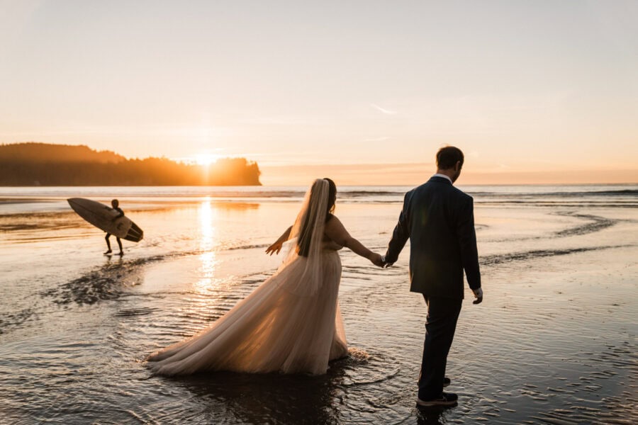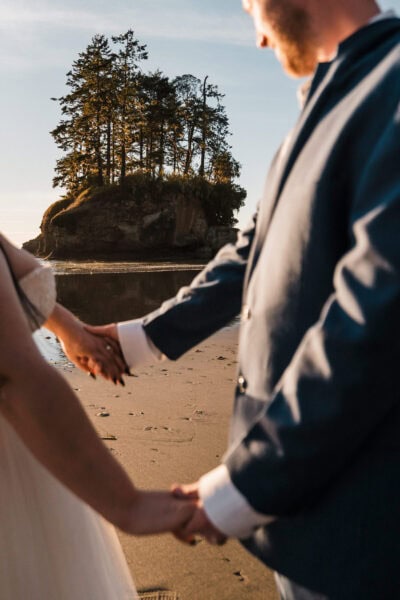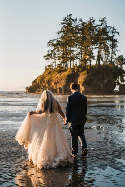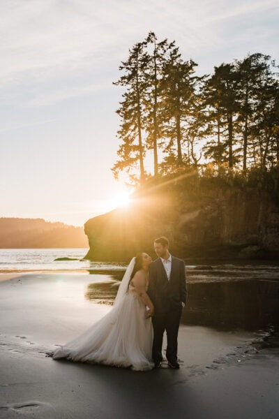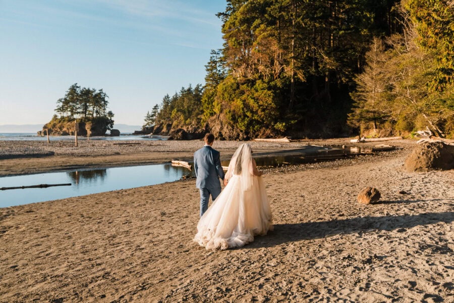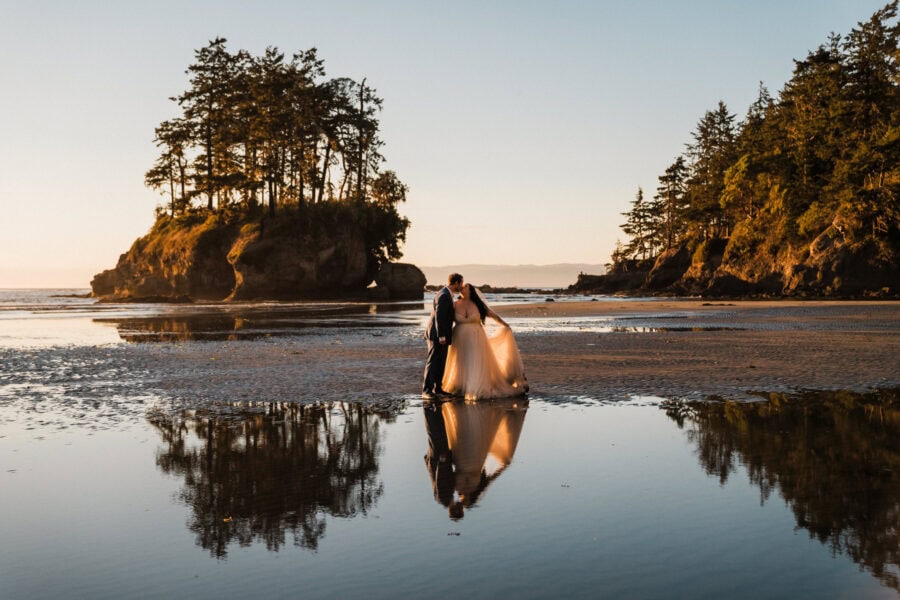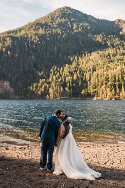 Your day begins at your cozy cabin Airbnb, where I’ll capture the details and anticipation of getting ready – those quiet, joyful moments before the adventure begins. From there, we’ll pack up our bikes and set out on the Spruce Railroad Trail, biking together through lush forest until we reach the iconic Devil’s Punch Bowl. Along the shores of Lake Crescent, with its glassy, glacier-blue waters and rugged mountain backdrop, you’ll exchange your vows in an intimate, natural setting.