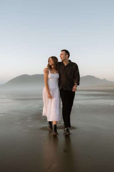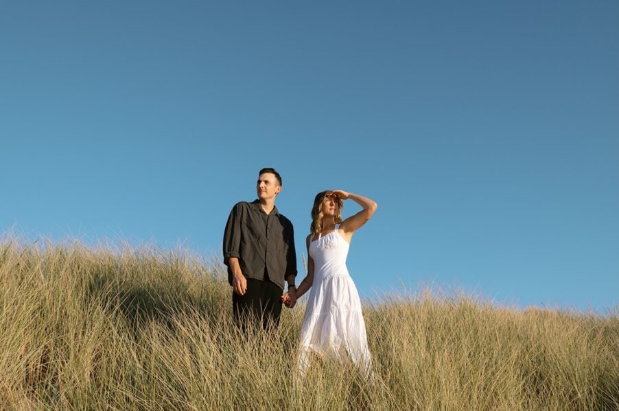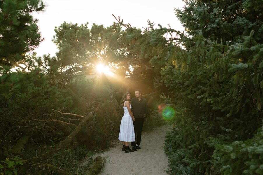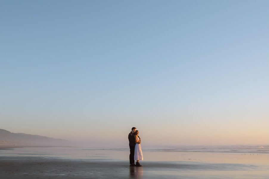 As the light softens, we head to Nehalem Beach for golden hour portraits along the dunes. The sun drops low over the Pacific, illuminating the grass and coastline while the distance cliffs stand steady behind you. We close the day with twilight portraits, maybe dipping our feet in the water, where the ocean glows beneath the fading sky and the moment feels quiet, intimate, and timeless.
