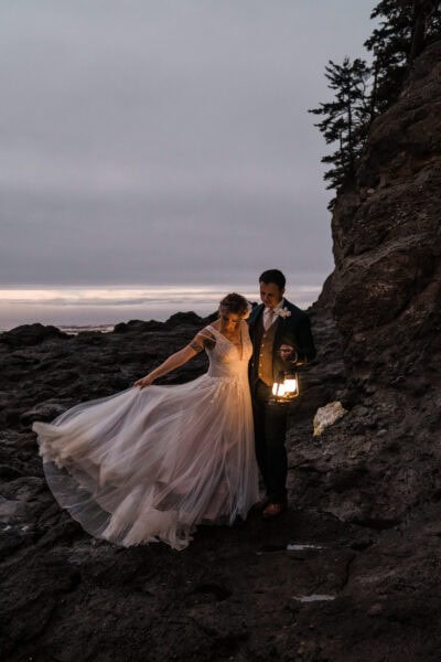 Day one is your micro wedding—an intimate beach ceremony with the Strait of Juan de Fuca and views of Canada stretching endlessly behind you. After exchanging vows surrounded by your closest loved ones, you’ll enjoy a private chef–prepared dinner, allowing you to savor incredible food and meaningful moments in the cozy comfort of the lodge. Next we’ll capture sunset portraits framed by the coastal cliffs, with golden light dancing off the water. As night falls, gather with guests for a campfire on the beach (weather permitting), sharing stories, toasts, and laughter as the waves roll in.