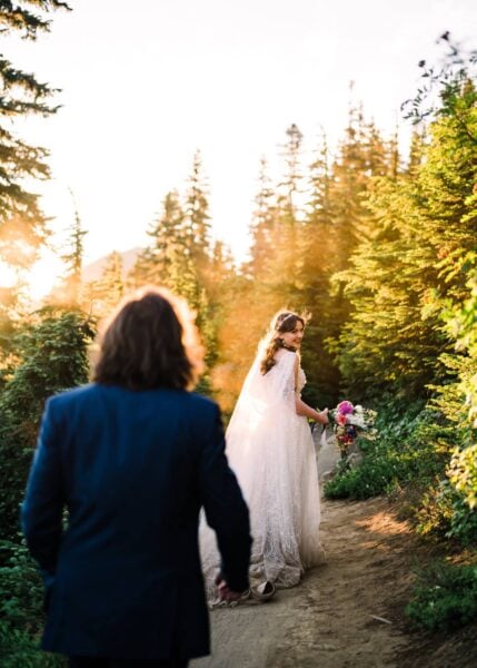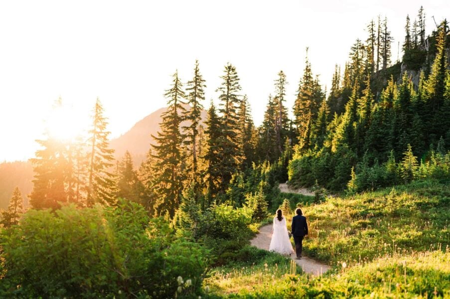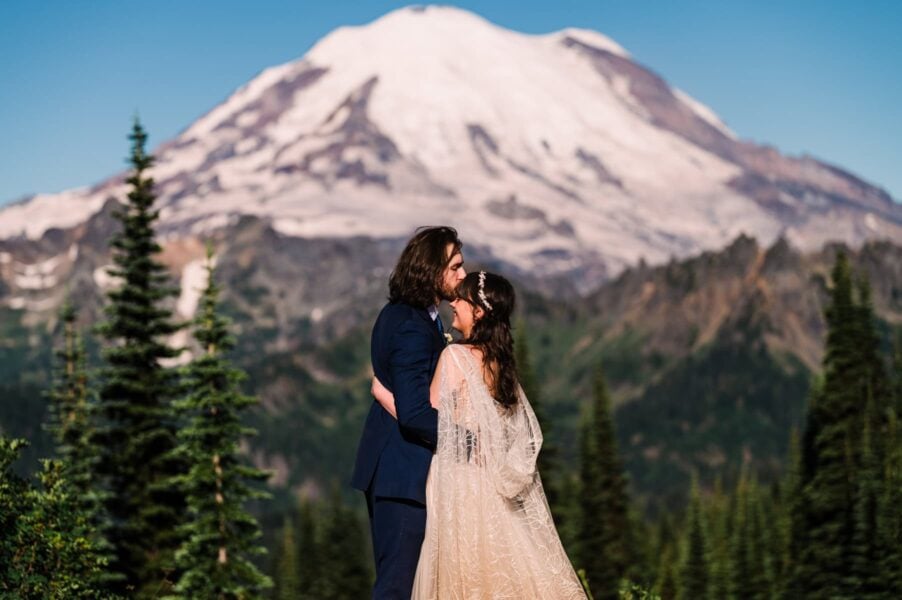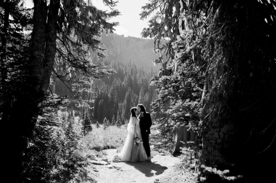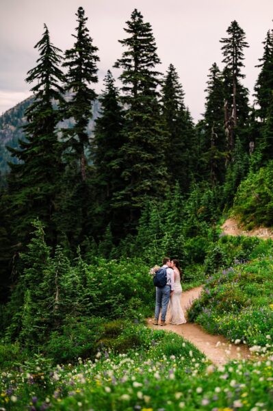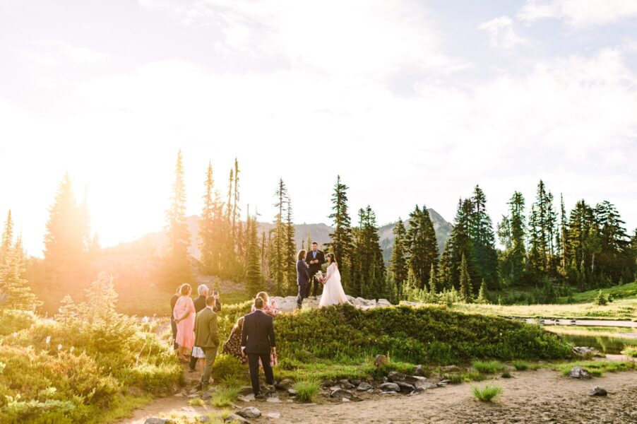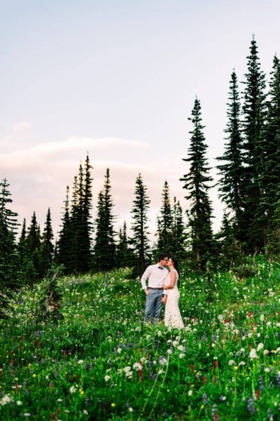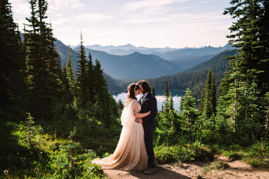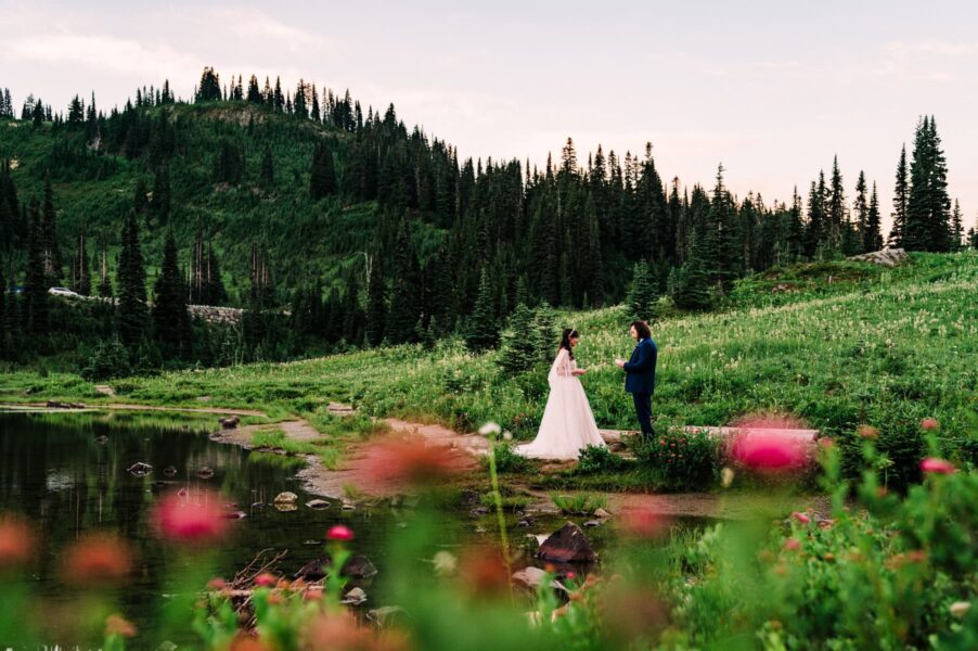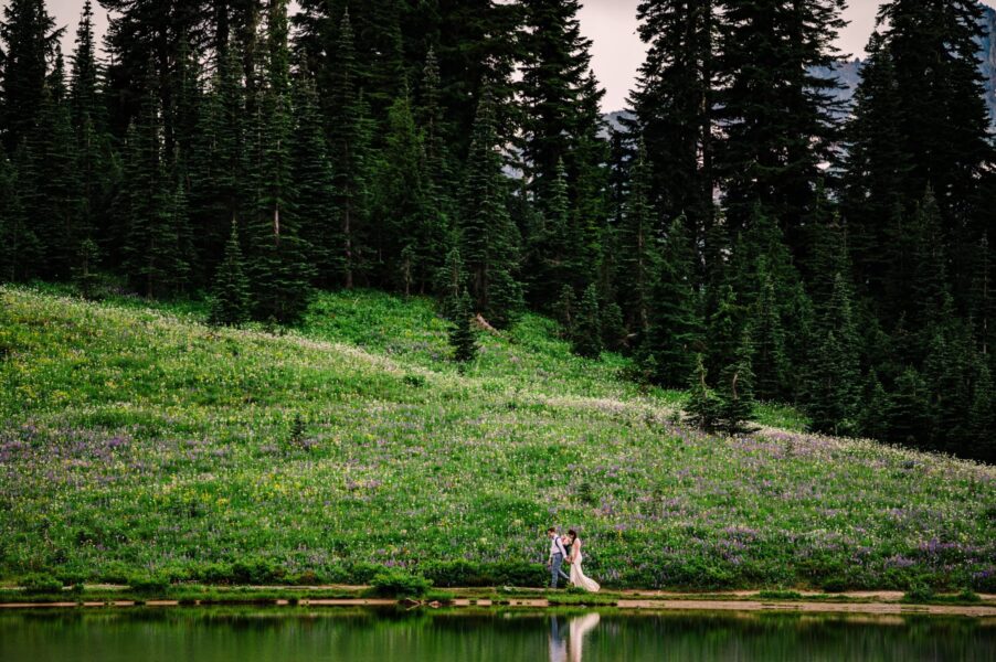 One of the most underrated spots in all of Mt. Rainier National Park is also one of the best places to see wildflowers bloom! We’ll start by exploring an easy-access lake with views of Mt. Rainier behind you, where you can do your first look, exchange private vows, or hold your ceremony if you have guests with limited mobility. After exploring the trails around the lake, we’ll set off on our hike, spotting blooms of every color surrounding us. Soon we’ll reach another lake, which is a perfect place to stop for a longer ceremony or a snack before continuing on to my very favorite view of Mt. Rainier herself.