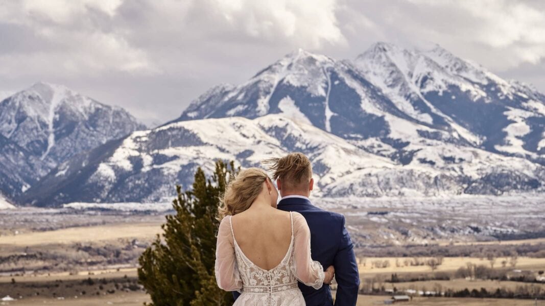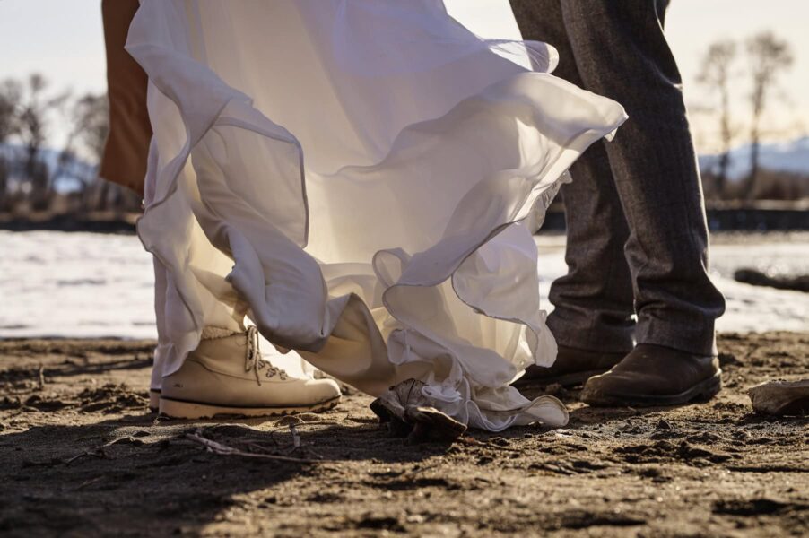 All warmed up and ready to continue on, you don your wedding attire and head to a nearby viewpoint over the Yellowstone River for your first look. The excitement only grows as you meander into and through the park, stopping at vistas along the way to take in the quiet serenity of the landscape. Bison lazily walk along the roads, undisturbed by your presence as you near the sweeping panorama of Lamar Valley. Here, you have free reign of the wide open landscape and push off on your skis amidst the snow-covered meadows to say your private vows in total seclusion.