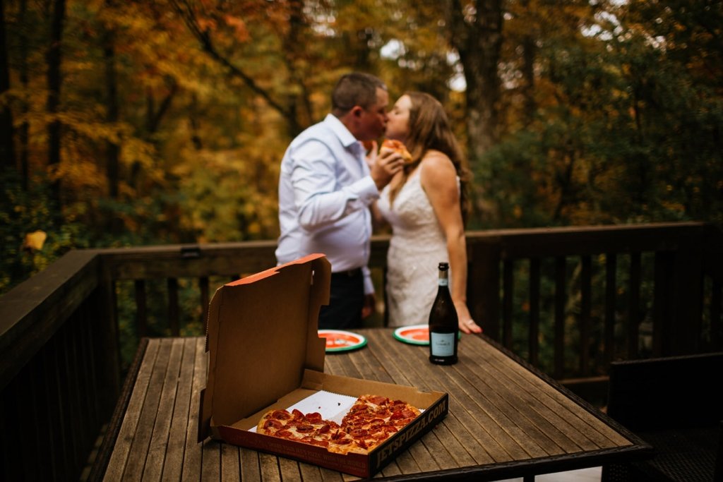 If you are thinking about eloping, then a great idea to incorporate is your favorite meal together. Since you only have to really worry about each other or the handful of immediate family you are inviting, you can indulge in whatever your heart desires! We personally love it when a couple enjoys some pizza together on their special day after eloping in the woods.