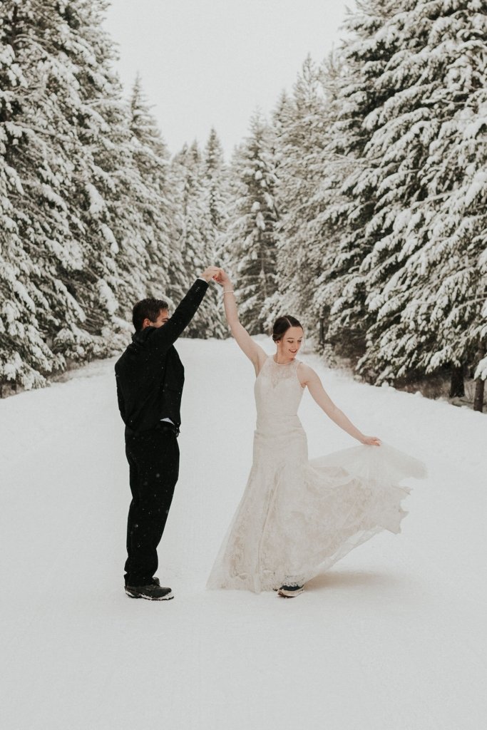 You most certainly can have a first dance during your elopement. We have seen many couples get flustered and doubt eloping because they don’t want to lose some of the wedding traditions they love. First dances during elopements are mesmerizing and memorable. Twirl around in your dress in the snow, on a mountain, in a desert, on a beach… The options are endless. Are you concerned about your first dance song? You can play your song on your phone, bring a small speaker, hire a musician, or sing to each other.