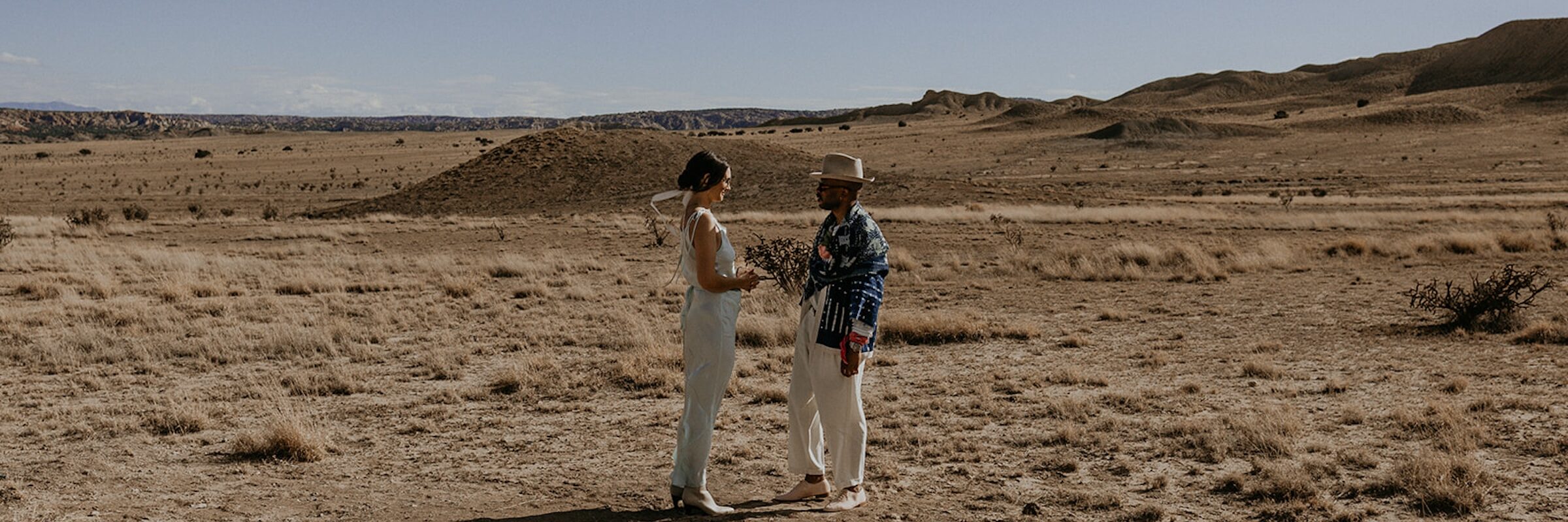 “Our officiant asked us some personal questions and wanted to know real details about Cait and I. It was great to share those moments with her before hand. We ended up paying homage to the land and incorporated this into our ceremony. The elopement felt like we were blending our natural aesthetics and our love of New Mexico together. It shows up in our Mood board we built to establish the stylings and wardrobe. “Between Earth and sky” was the idea and so it was real pretty medley of natural blues, sand, and earth.” [Jay, the groom]