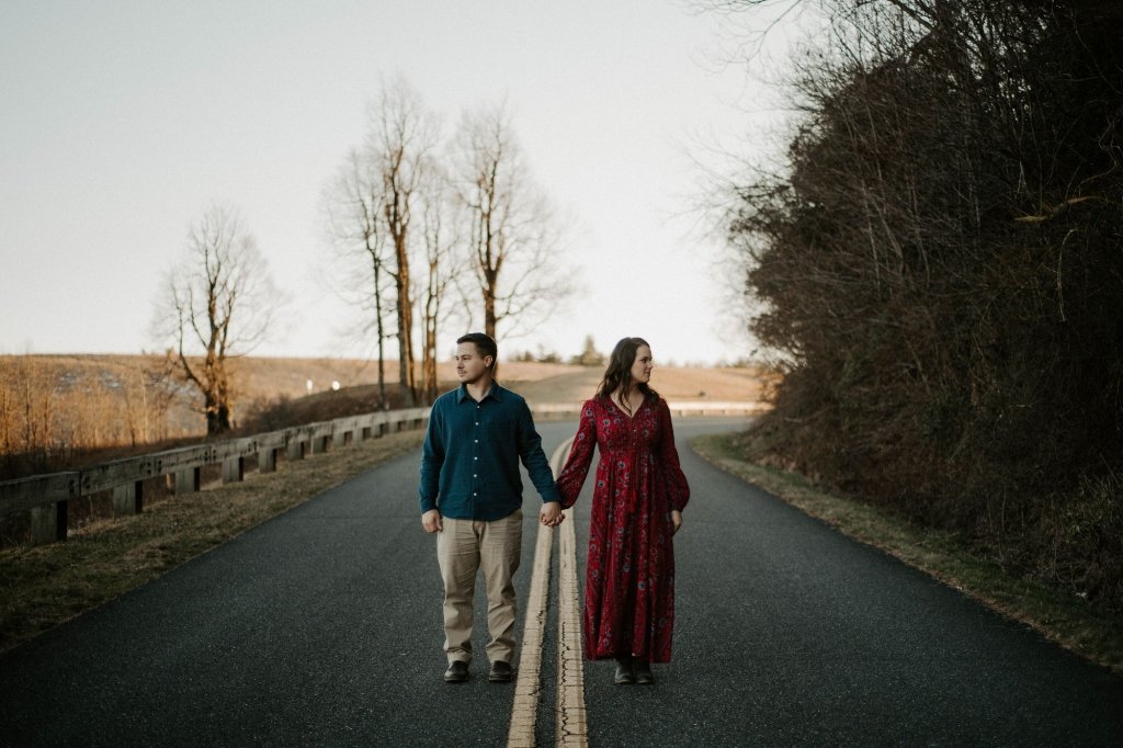 We know this pose sounds strange, but take our word on this one. All you want to do is walk side by side and bump your hips together. Another trick is walking side to side together. Creating movement is a major plus for natural photos. It may feel a little silly but, we guarantee you’ll be laughing. Walking photos add motion and a sense of playfulness to your engagement session. This pose feels natural and relaxed, especially for couples who want candid moments.