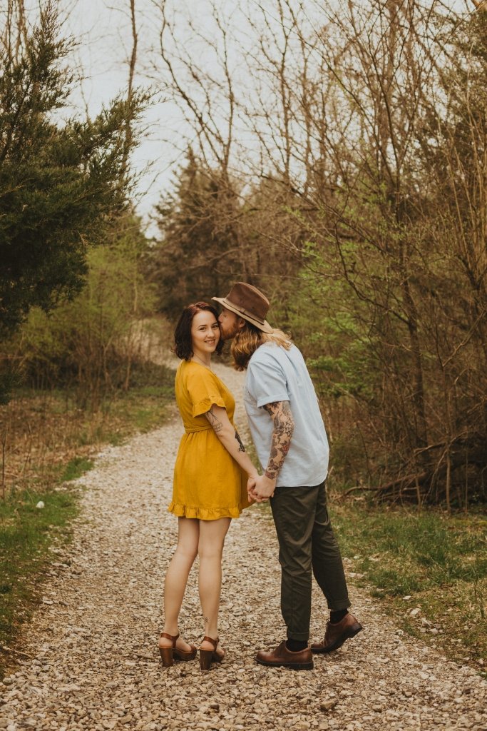 Another great engagement pose is to walk away from your photographer, stop, and look back. Your partner can spontaneously kiss you, or you both can just look back.