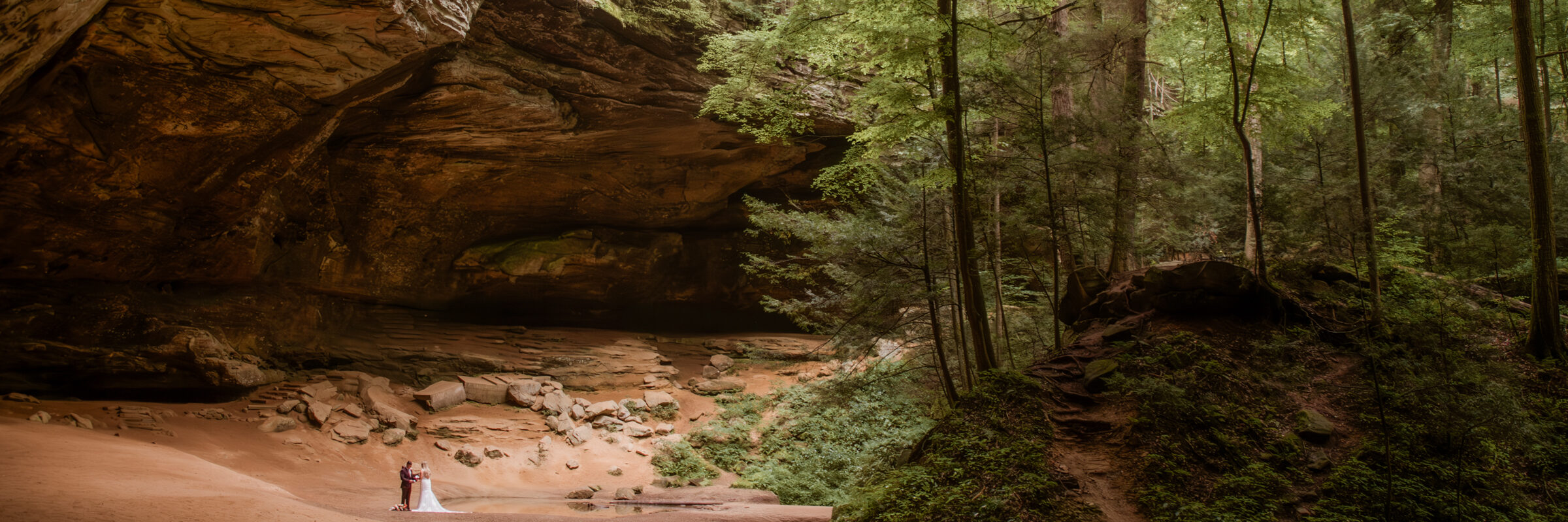 Hayleigh and Dana chose to elope to Hocking Hills, Ohio, to have a simple, intimate wedding day focused on their love for each other. They wanted a private, meaningful ceremony without the pressures of a large event, opting for a quiet vow exchange under the waterfall at Ash Cave. Despite the drought affecting the waterfall, the serene surroundings provided the perfect backdrop for their romantic day, followed by a stunning portrait session at Old Man’s Cave. Get all the details below.