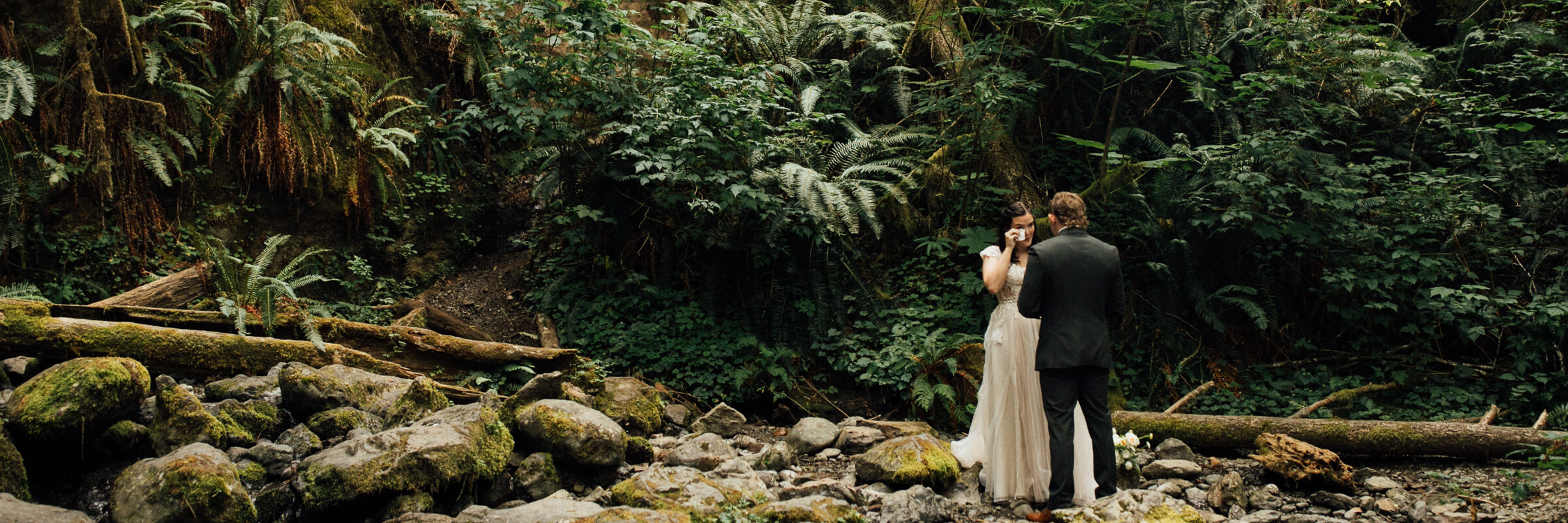 We started with emotional first look and exchanged heartfelt vows amidst the misty spray of the falls. From there we adventured into the Quinault Rainforest for their ceremony with their loved ones, and portraits in the forest. It was a destination elopement for them. Seeing them in awe of the vibrant greens and tranquil atmosphere of the rainforest was something so endearing to watch.
