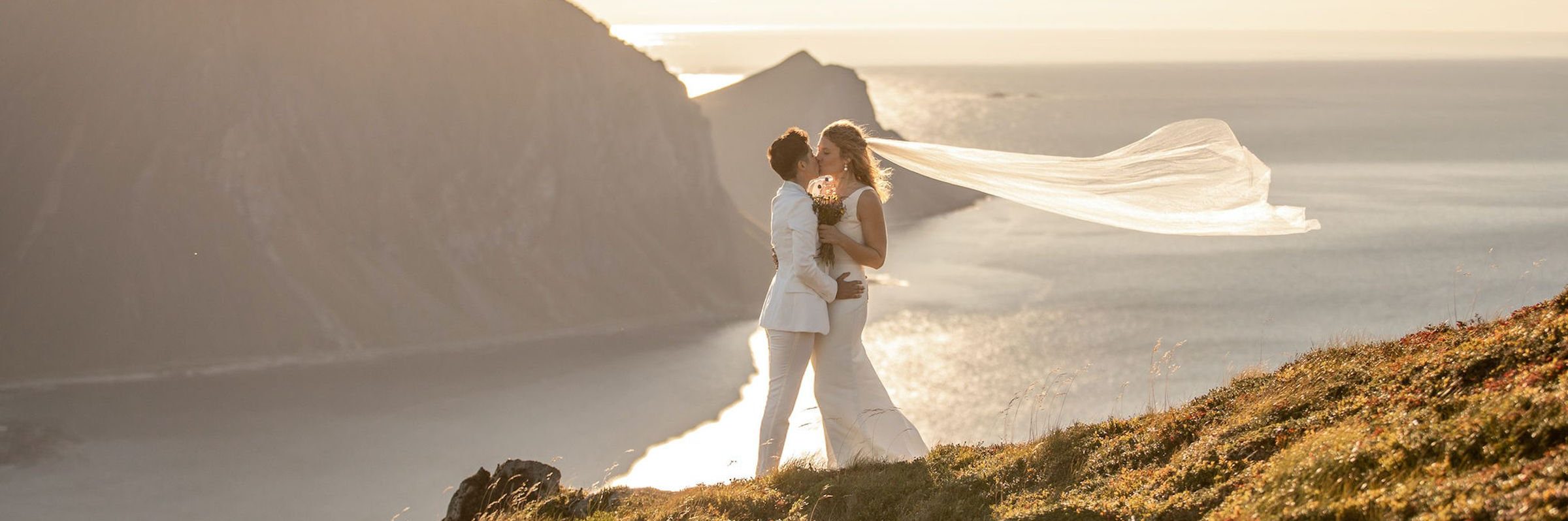 The elopement of these two stunning brides (Christine and Jasmin) started with a horseback riding tour along the beach on the Lofoten Islands in Norway. The next day they hiked up to a mountaintop where they exchanged their vows at the summit, surrounded by the most beautiful view over the fjords and mountains of Northern Norway. This mountain view elopement in Lofoten Islands is the perfect inspiration for you to elope this year. Get all the details below.